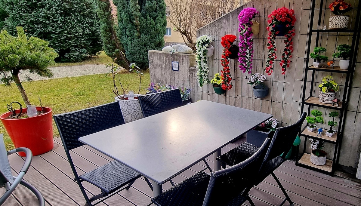 En los Alpes suizos, a 30 minutos de las principales estaciones de esquí, encontrará en el corazón de nuestra villa familiar un apartamento de 2,5 habitaciones. Magníficas vistas a las montañas/Cervin y al pueblo, cerca del viñedo. Tranquilo. Disfrute de un jacuzzi gratuito en nuestro lado del jardín familiar. El apartamento privado consta de 1 dormitorio separado, sala de estar, cocina abierta con ventanal en la terraza (de uso exclusivo para usted), sofá cama. Televisión, wifi, ducha, inodoro, columna de lavado.