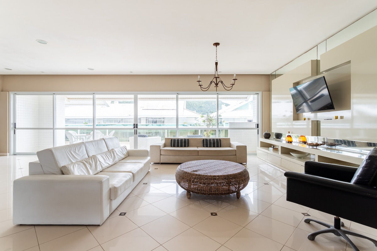 ¡Excelente casa con acceso directo a la playa! Hay 4 dormitorios, 3 suites, balcón y zona de barbacoa conectados al jardín y a la piscina. ¡Ubicado en un condominio con solo 3 residencias,en una calle tranquila, con fácil acceso a las mejores playas del norte de la isla! A cinco minutos desde Jurerê. Condominio exclusivo con alojamiento familiar. La piscina y el gran césped solo se comparten con las tres residencias. Acogedor,con referencias mediterráneas, ¡aquí puedes relajarte de pie sobre la arena!