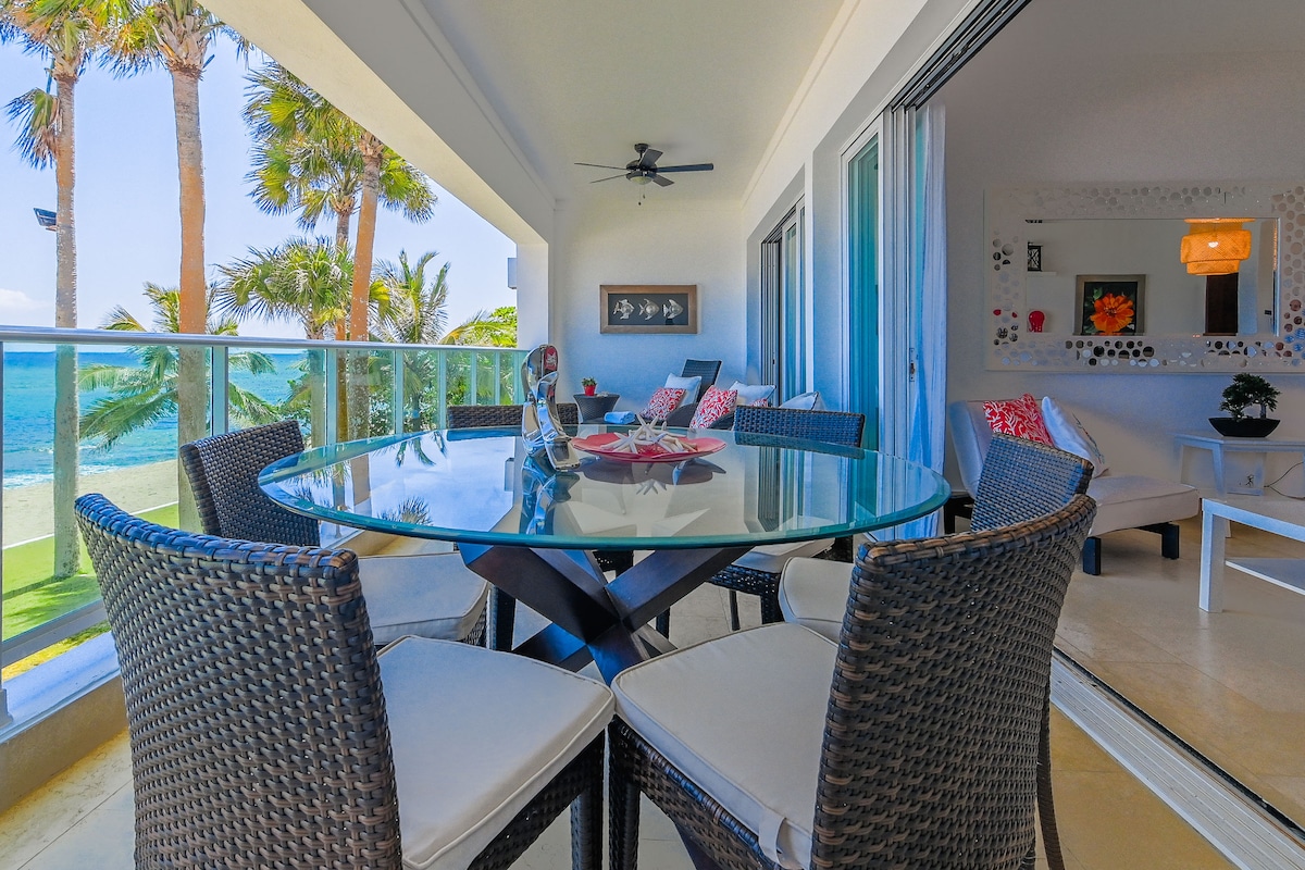 ¡Tu oasis frente al mar te espera! ¡Despiértate con las olas y sumérgete en el paraíso! Más que un apartamento, es tu portal a una escapada inolvidable frente al mar. Pasa de tu sala de estar al reluciente balcón, donde las vistas panorámicas del mar turquesa se extienden hasta el infinito. - Increíble vista al mar - Aparcamiento privado y seguridad 24/7 -2 dormitorios / 2,5 baños - Aire acondicionado en todas las habitaciones - Cocina grande. - Lavadora/secadora. - Cama tamaño king y cama tamaño queen - Baños en suite en ambos dormitorios - Baño de invitados - Televisor inteligente de 70 pulgadas.