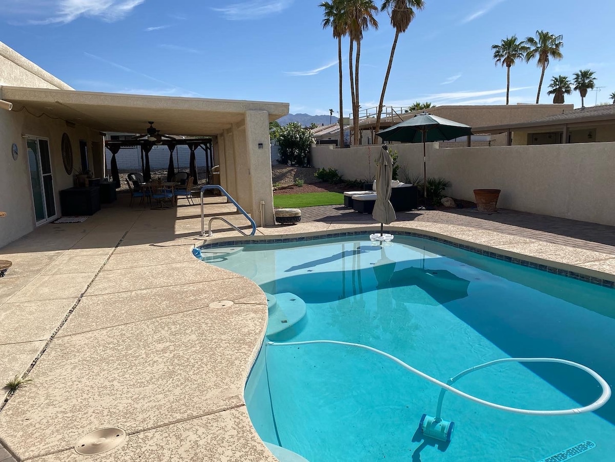 REFRESHED HOME 2024 - This Tropical Oasis Pool Home with Backyard Misters is waiting for you! Our home features 3 bedrooms & 2 bathrooms & is Immaculately clean. This home is conveniently located near everything in Lake Havasu & minutes away from Windsor Launch Ramp. It has new paint, new appliances, new towels, new cookware, 75" smart TV in the living room & 75" in master, BBQ, & much more! This home is perfect for bringing your family or entertaining your friends any time of the year.