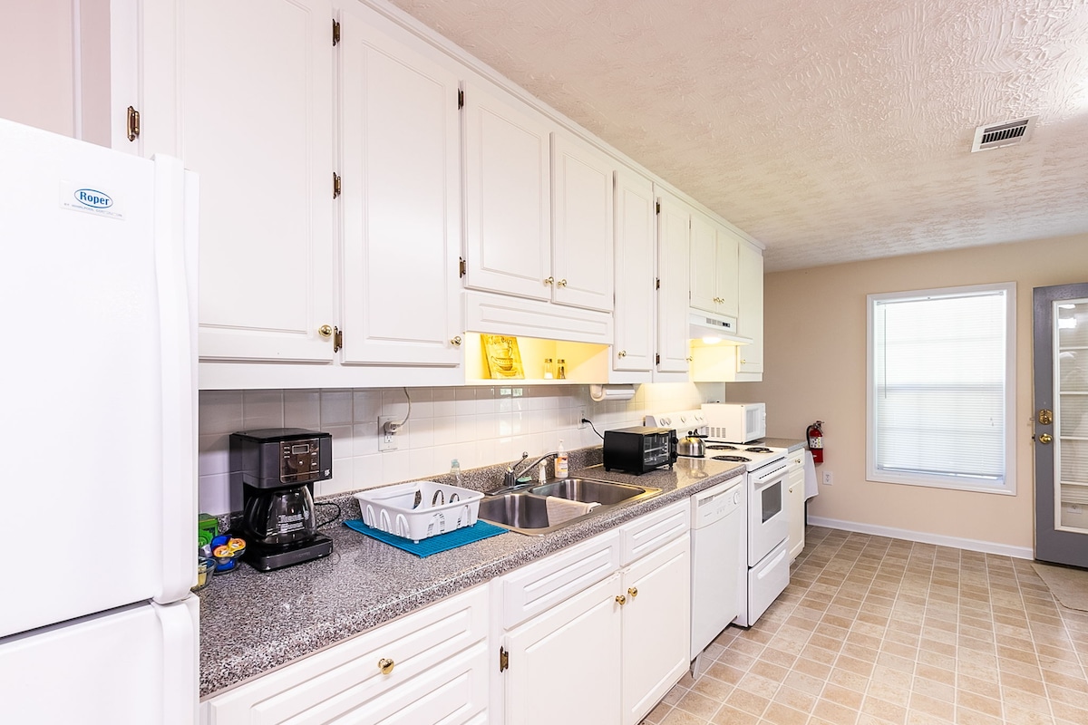 Relájate y desconecta en tu cómoda habitación con entrada privada desde tu terraza. Disfruta de tu televisor de 40 pulgadas desde la cómoda cama completa. ¿Necesitas espacio para trabajar? Tienes una bonita mesa de café y sillas en tu habitación y en tu patio. Tu cocina pequeña tiene un pequeño fregadero, nevera, microondas, olla caliente, cafetera de goteo/Keurig, platos y armarios de almacenamiento. Disfruta de suaves toallas blancas y sábanas suaves. También cuenta con plancha y tabla de planchar.