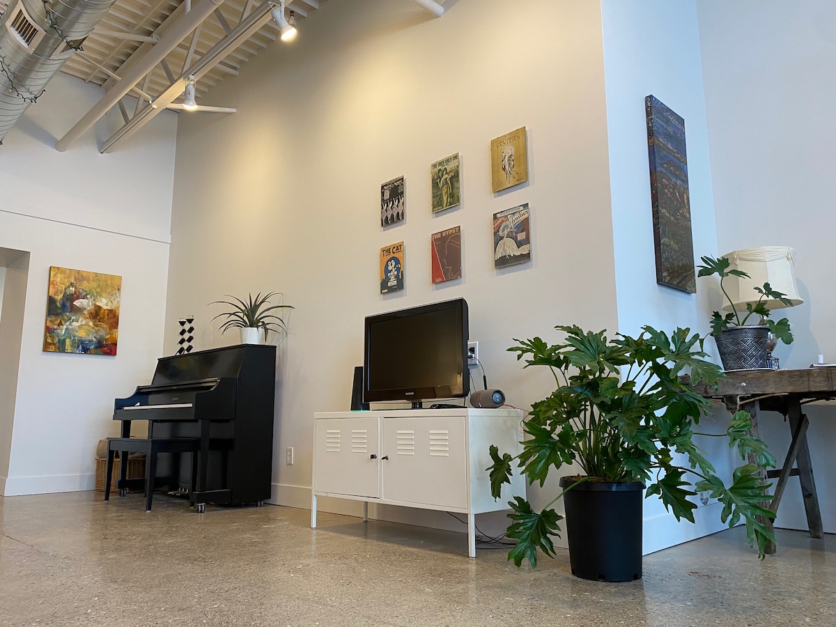 ¡Verdadero espacio de loft de vida de artista! Único espacio en una zona segura de los suburbios occidentales cerca de la ciudad y fácil traslado a tiendas, tiendas muy cerca de trenes, autobuses y autopistas. Estacionamiento privado. No hay unidad por encima o por debajo. Trado y espacioso y privado, amplio y abierto. Pisos de madera en todo el baño de diseño de acero de calor forzado y aire acondicionado. Horno doble, lavavajillas, cocina eléctrica, nevera, microondas y horno tostador. Ventiladores de techo con dos camas. Puede dormir 6 por un costo adicional