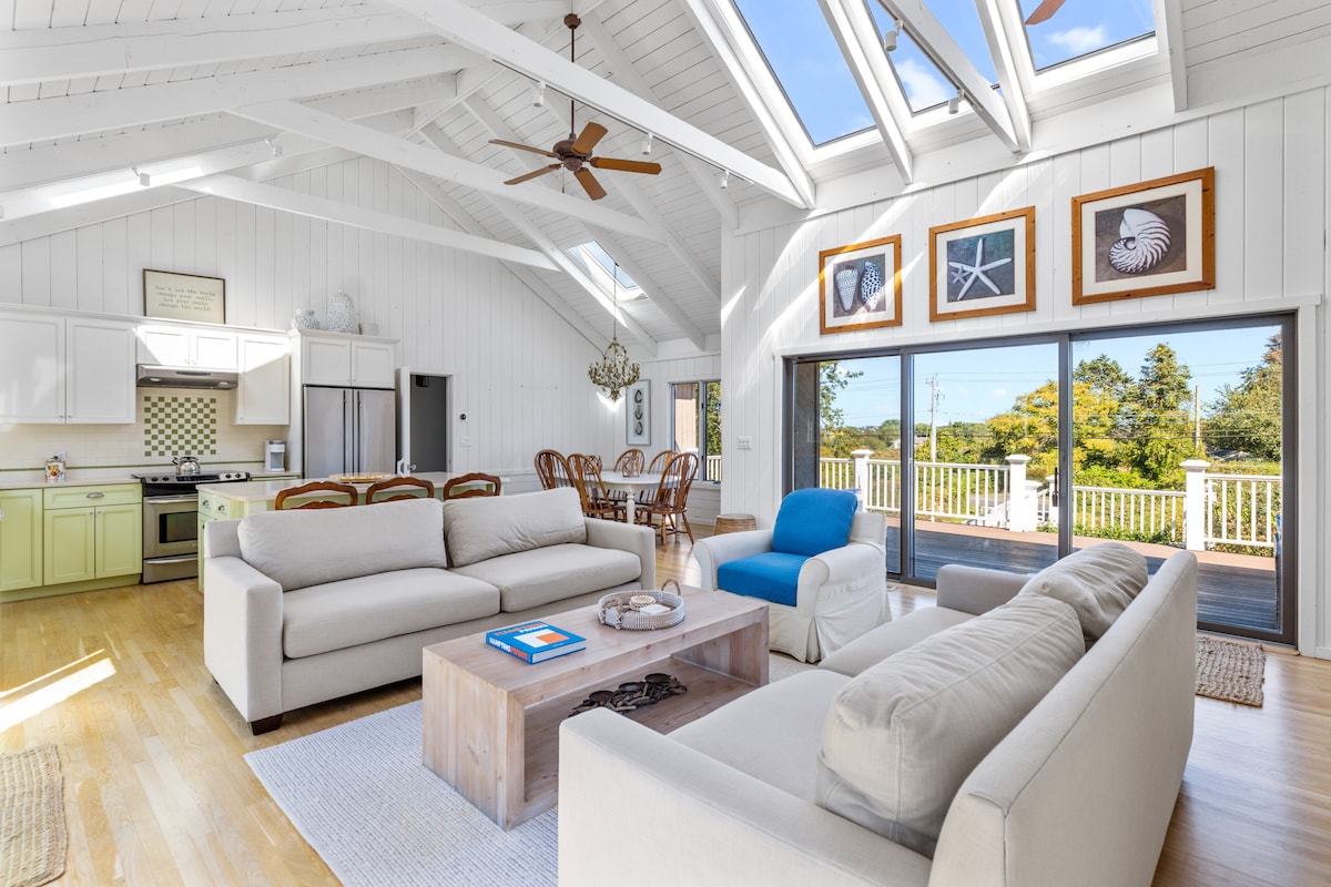 Amplia casa justo en Fort Pond con un ambiente bohemio relajado. Disfruta de la cocina abierta, las vigas de madera reciclada y los muebles hechos a mano. Acceso directo al agua desde el patio trasero. Hay otras dos cabañas que también tienen dos dormitorios cada una en la propiedad. Vivimos en la propiedad a tiempo completo y disfrutamos haciendo de nuestro espacio un entorno seguro y limpio.