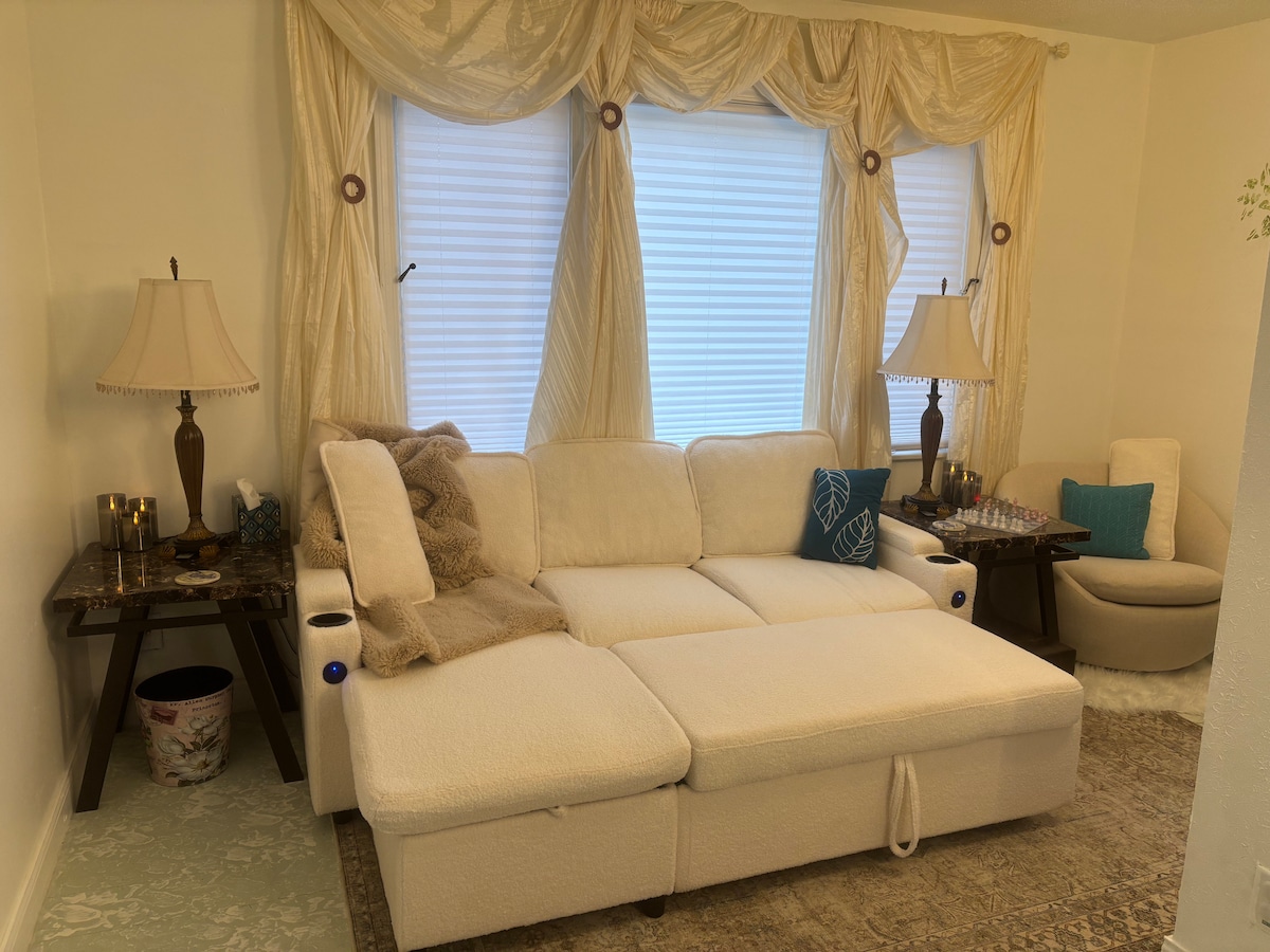 ¡Nuestro espacio de nivel inferior está diseñado para proporcionarte todo lo que necesitas! ¡Es acogedor y limpio! Tendrás aparcamiento gratuito en la calle, tu propia entrada privada, baño y cocina americana equipada con varios electrodomésticos pequeños. También hay espacio de almacenamiento disponible. Check-in autónomo con caja de seguridad. Gente alta, tenga cuidado: ¡este es un espacio en el sótano! Los techos son de 79 pulgadas. El baño es aún más bajo. Para los que sufren de alergia a los gatos, tenemos gatos en el piso principal, pero nunca se les permite entrar en el espacio de los huéspedes. (¡Lee TODOS los detalles del anuncio!)