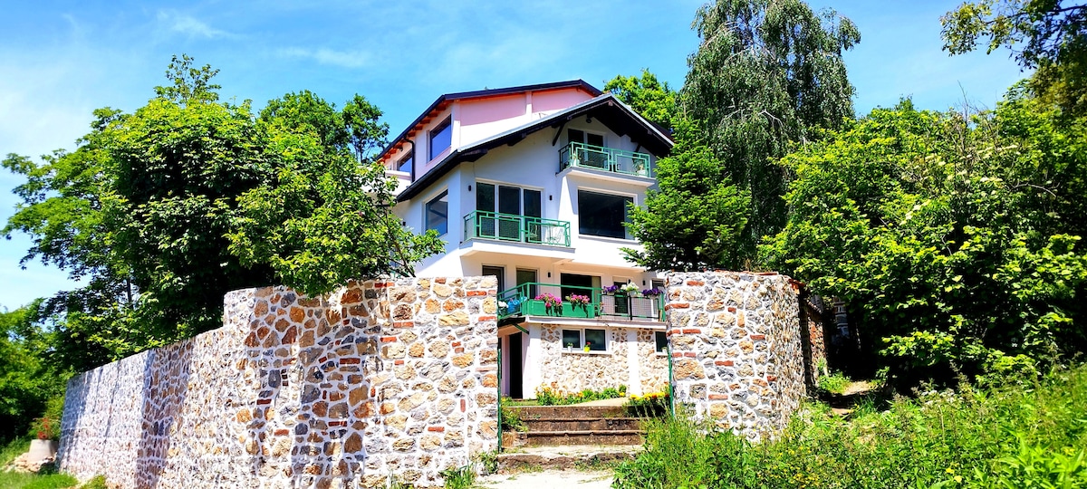 Located at the highest point of Pestani (Ohrid), the yours suite (second floor) offers a unique view of Lake Ohrid and mountain Galicica. Surrounded by greenery and an abundance of nature, you can enjoy on one of the 5 terraces overlooking the lake or the mountain, or simply sit in the garden by the fountain and listen to the sound of the river. In your de luxe suite you have 2 bedrooms, 1 living room, a full equipment kitchen, bathroom, toilet, closed terrace with fire p and huge green garden.