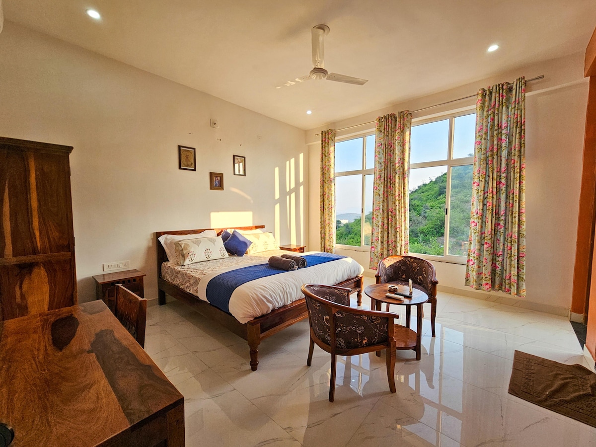 Relájate en esta impresionante y espaciosa habitación construida con cariño, con suelo de piedra, detalles antiguos y muebles que aportan un toque lujoso y encantador, situada justo en el corazón de la ciudad. Habitación nueva y muy limpia con baño privado y cocina. Este alojamiento está a 2 minutos a pie de Ambrai Ghat y otras atracciones importantes de Udaipur. Sabemos lo importante que es sentirse como en casa, cómodo y relajado. Conéctate al -9928669922.