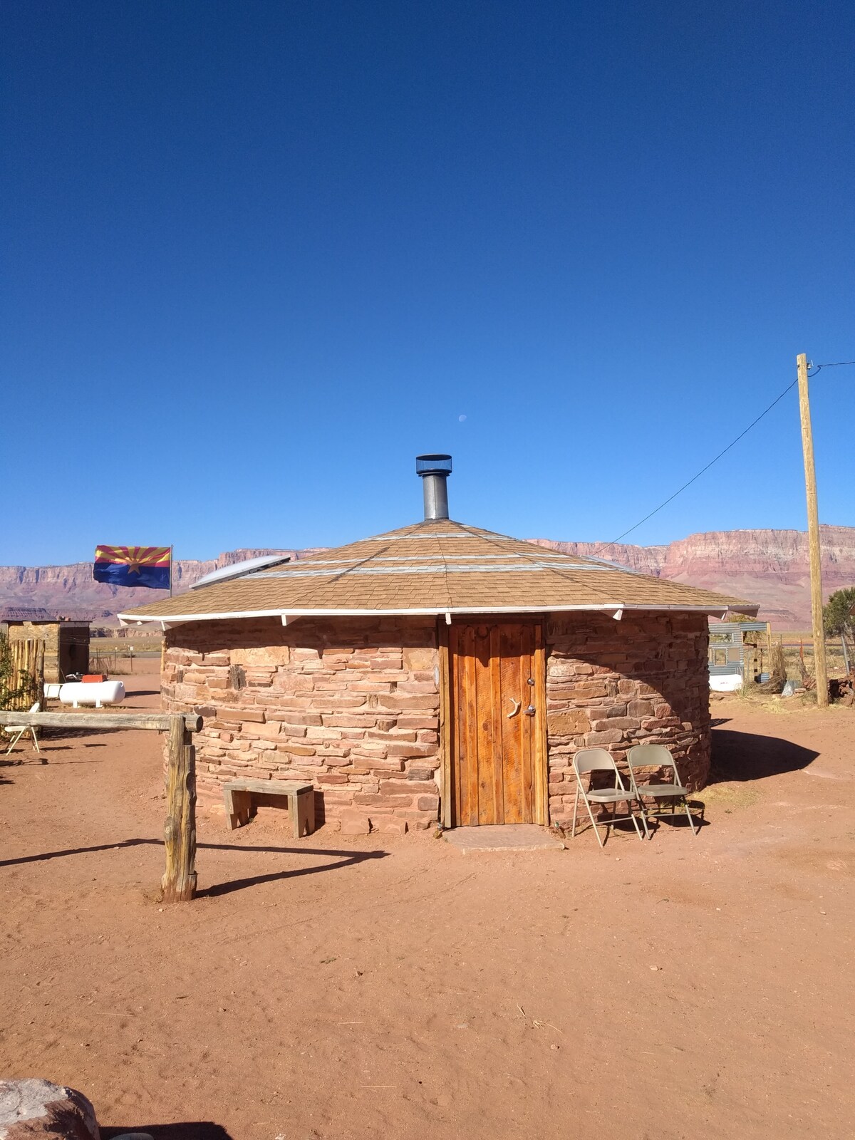 Un hogan navajo tradicional hecho de arenisca local ubicado cerca de Lees Ferry en la Reserva Navajo. Es una gran habitación abierta con estufa de leña y dos camas individuales y dos catres. Tenemos a mano 12 galones de agua fresca culinaria/potable y una cocina de campamento con caja de mandriles. No hay tuberías ni ducha en el interior. Pedimos a nuestros huéspedes que utilicen nuestro baño exterior limpio y en buen estado a un corto paseo de distancia.