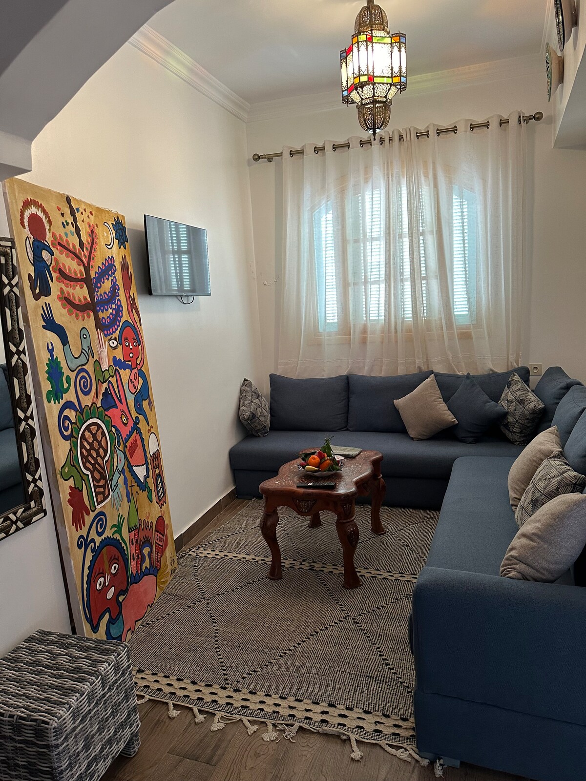 Este apartamento moderno tradicional en el corazón de la medina de Assilah está a solo 3 minutos a pie del mar. Cuenta con un cómodo dormitorio doble, dos sofás y una cocina totalmente equipada. Disfruta de wifi gratuito y aire acondicionado para una estancia agradable. Este lugar especial está cerca de todo, por lo que es fácil planificar tu visita. Si quieres desayunar durante tu estancia, se puede proporcionar por una tarifa adicional de € 5 por persona. También para cualquier otra comida 👂requerimos acta de matrimonio para pareja marroquí