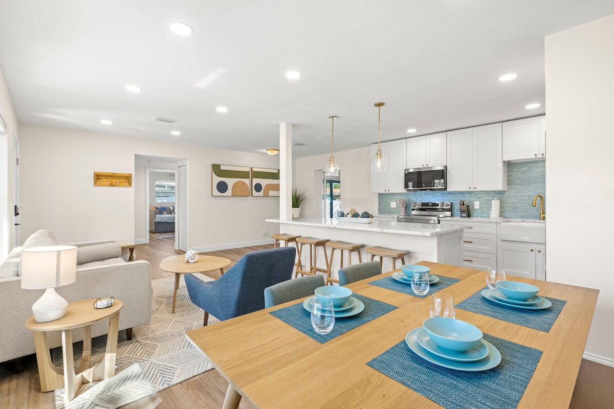 ¡Te damos la bienvenida a tu escapada de ensueño a Florida! Esta casa de 3 dormitorios y 2 baños recientemente renovada combina el ambiente de un hotel boutique con una comodidad acogedora, a solo 7 millas de las playas de Clearwater e Indian Rocks. Apto para perros y familias, cuenta con un patio trasero completamente vallado, un porche con mosquiteras y equipo de playa para facilitar las aventuras. Tanto si buscas sol, tranquilidad o hacer turismo, este elegante refugio es la base perfecta para que crees recuerdos inolvidables. ¡Ideal para trabajadores remotos y viajeros de negocios!