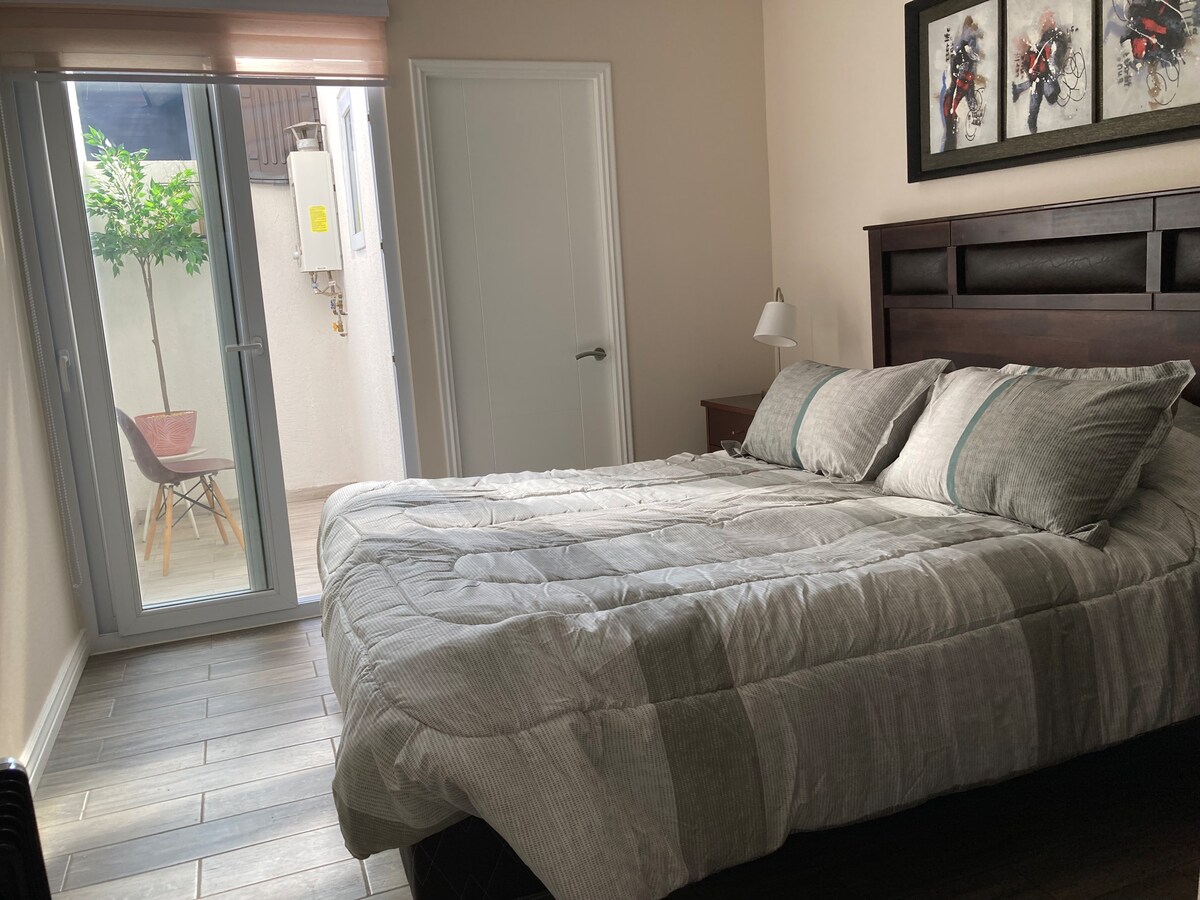 Disfruta de la sencillez de este alojamiento cómodo, tranquilo y céntrico, ideal para una larga estancia. En Las Condes, esta casa interior para dos personas tiene entrada y estacionamiento independiente. A pasos del metro Bilbao, supermercados, tiendas, plazas y clínica deportiva, con excelentes accesos de transporte a toda la capital. En un barrio céntrico y seguro, ofrece un dormitorio amplio con cama king, baño y cocina equipados, Wi-Fi, TV inteligente, calefacción y un lindo patio.