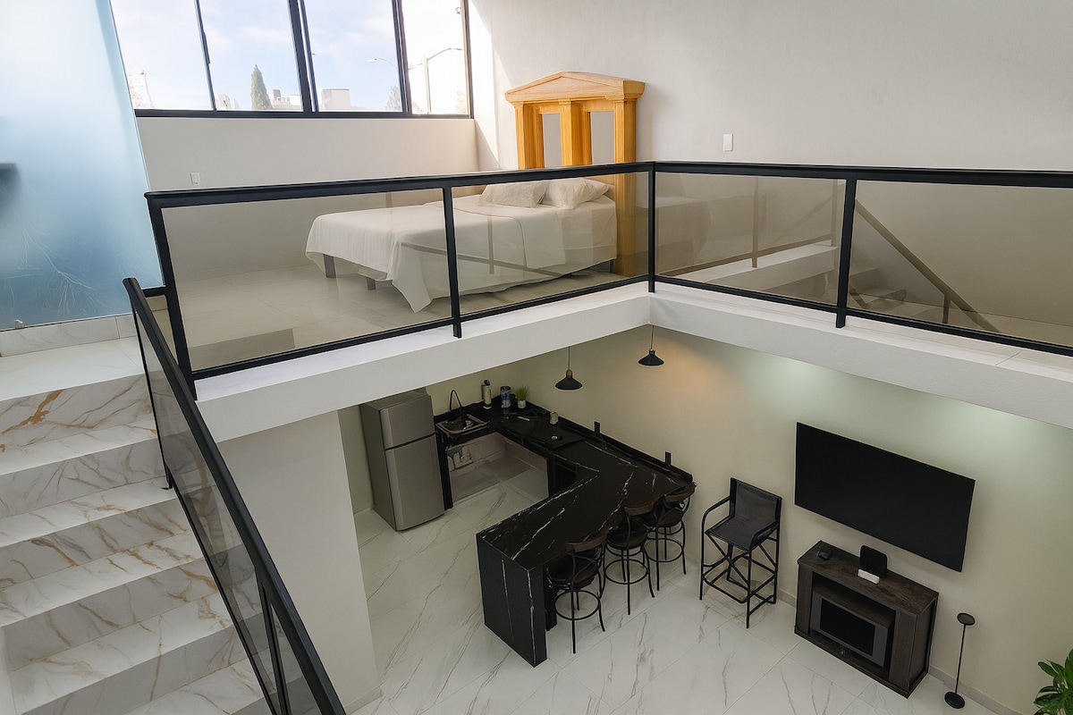 Hermoso y elegante Loft muy cerca del centro de Tlaquepaque donde encontrarás experiencias culinarias, culturales, amenidades y vida nocturna, a unos minutos caminando del tren que conecta toda la ciudad. El Loft cuenta con Aire acondicionado en habitación, área de cocina y sala, cuenta con ducha de lluvia de alta y media presión, cerradura digital, pantalla 4K, internet de alta velocidad 210 Mbps, y sensor CO2. No cuenta con cochera Disfruta de una hospedaje con estilo y elegancia