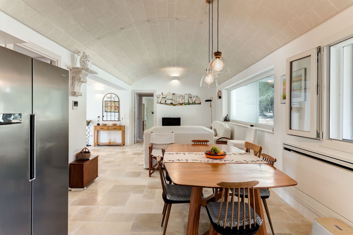 Esta villa y trullo de 1780, llamado trullo Fedele Bonotto, han sido completamente restaurados, pero aún se encuentran entre los olivos centenarios de la zona. Admira las históricas paredes de piedra, relájate en la piscina privada y el solárium, y disfruta de la hermosa zona del jardín, todo exclusivo para los huéspedes y su privacidad. El personal que se encarga de la limpieza de los espacios externos e internos de la propiedad sigue estrictamente las normas sanitarias previstas para la COVID-19. Antes de la llegada de cada huésped, se lleva a cabo un saneamiento completo. El tamaño de la casa y el gran jardín garantizan absolutamente las distancias de seguridad social y sin contacto. La villa, con olivos centenarios, tiene un comedor y una cocina totalmente equipada con utensilios y vajilla, lavavajillas, nevera y horno. Gracias a un pasillo se llega a los dos dormitorios dobles, cada uno con su propio baño. Separado de la villa, con entrada independiente, se accede al trullo, de unos 50 m2 de superficie, donde hay una cama doble, un sofá cama doble y un baño privado. En la zona exterior hay una gran mesa con 10 sillas, varios asientos, una barbacoa y la piscina para uso exclusivo de los huéspedes. También está unido a la villa el cuarto de la caldera con lavandería, completo con lavadora. ¡Toda la estructura es para uso exclusivo de los huéspedes que pueden vivir en estos momentos inolvidables de descanso y tranquilidad! Los huéspedes tienen el uso exclusivo de toda la villa y del trullo adjunto, y de toda la zona al aire libre, que incluye la sala de estar, la piscina y la lavandería. Inmersa en la impresionante campiña, la casa está situada cerca del centro de Ceglie Messapica. Cena en excepcionales restaurantes de propiedad familiar, navega por los mercados locales y da un paseo a pie o en bicicleta por los valles. Tienes un aparcamiento para tu coche, en 20 minutos llegas a las playas del mar Adriático, en 30 minutos puedes llegar a las playas del mar Jónico.