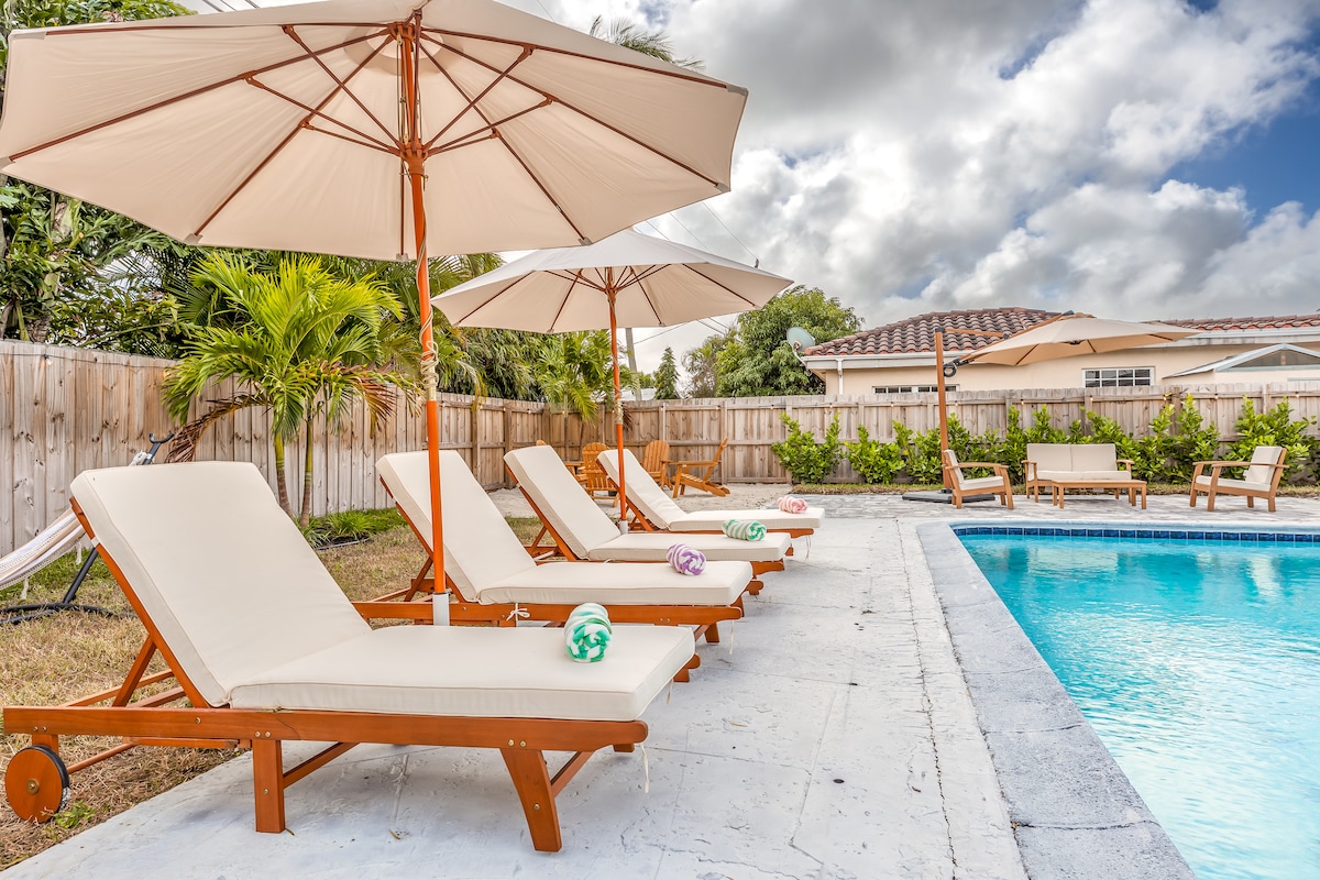 ¡Le damos la bienvenida a Sunhouse, su oasis privado con piscina en una ubicación perfecta: a solo 1,3 millas de la playa y del Pompano Beach Fishing Village! ¡Eso es un trayecto de 5 minutos en auto! ¡Esta casa es el refugio perfecto en Florida, con todo lo que necesita y, además, el lujo de su propia (GRAN) piscina climatizada! Relájate en el patio trasero con cómodas tumbonas, sillas adirondack, barbacoa y juguetes para la piscina. ¿Quiere explorar? ¡Súbase a nuestras bicicletas y dé un paseo rápido de 10 minutos hasta una de las mejores playas de Florida, donde encontrará los mejores restaurantes y tiendas!