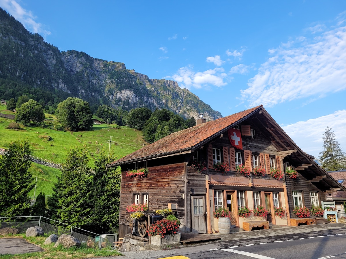 Los propietarios locales (Alain y Leila) viven en la casa y están a tu disposición. Ubicación céntrica pero tranquila. Vista única sobre los tejados de Lauterbrunnen con panorama de montaña. Internet de alta velocidad de más de 200 Mbit. NUEVO 2019: todas las ventanas con triple acristalamiento en toda la casa. NUEVO: Dormitorios nuevos en mayo de 2020.
