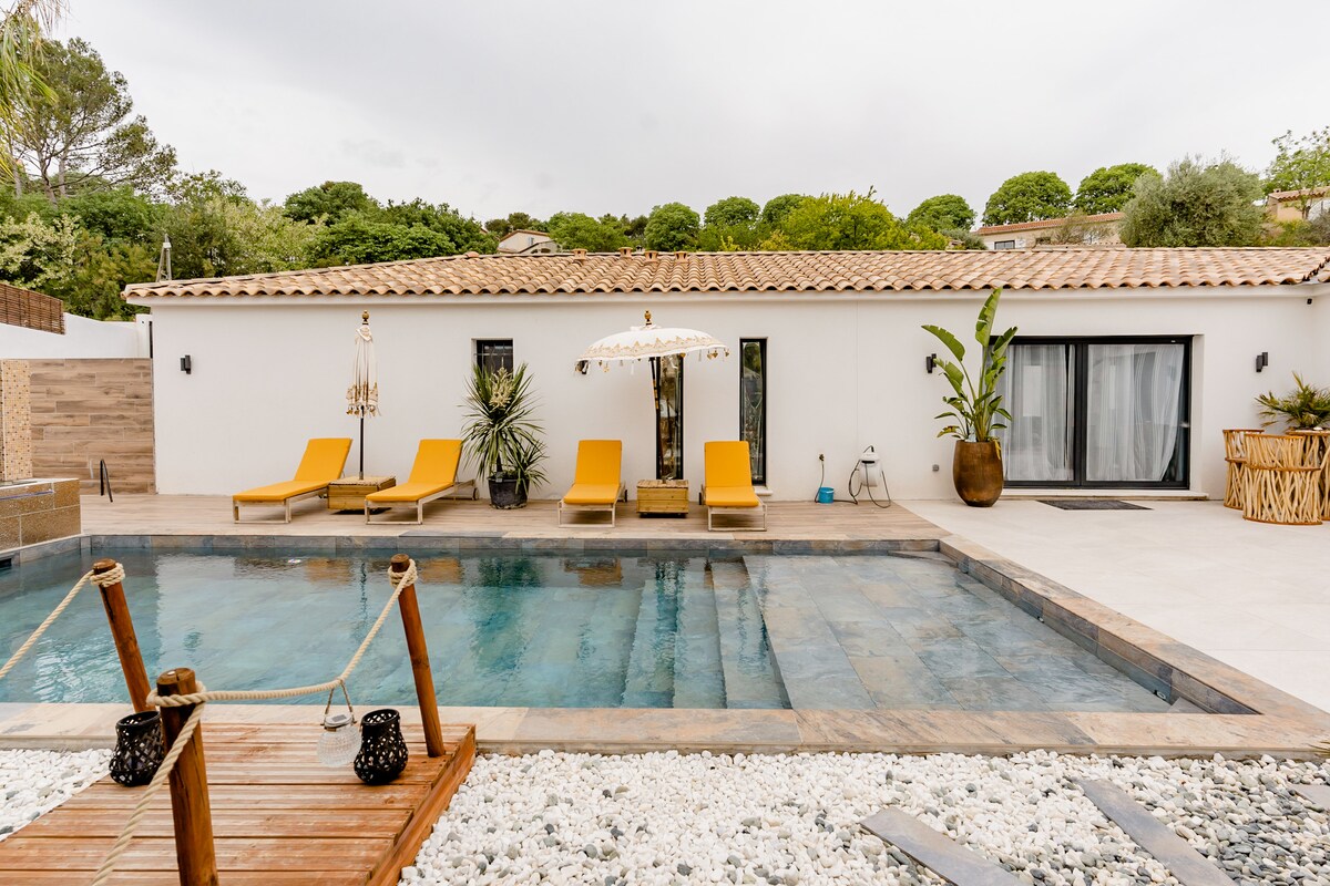 T1 nuevo de 37 m2 nuevo en un entorno idílico en la planta baja de una villa familiar al pie de las colinas de Pagnol. Terraza de 18 m2 para su desayuno al pie del roble. Piscina semi privada (pueden entrar Karin y Marc) accesible según su disfrute con barrera de seguridad para sus hijos bajo su responsabilidad. Habitación de 13 m2 con cama doble. Zona de estar con sofá cama doble cómoda abierta a la cocina equipada. NO SE ADMITEN MASCOTAS