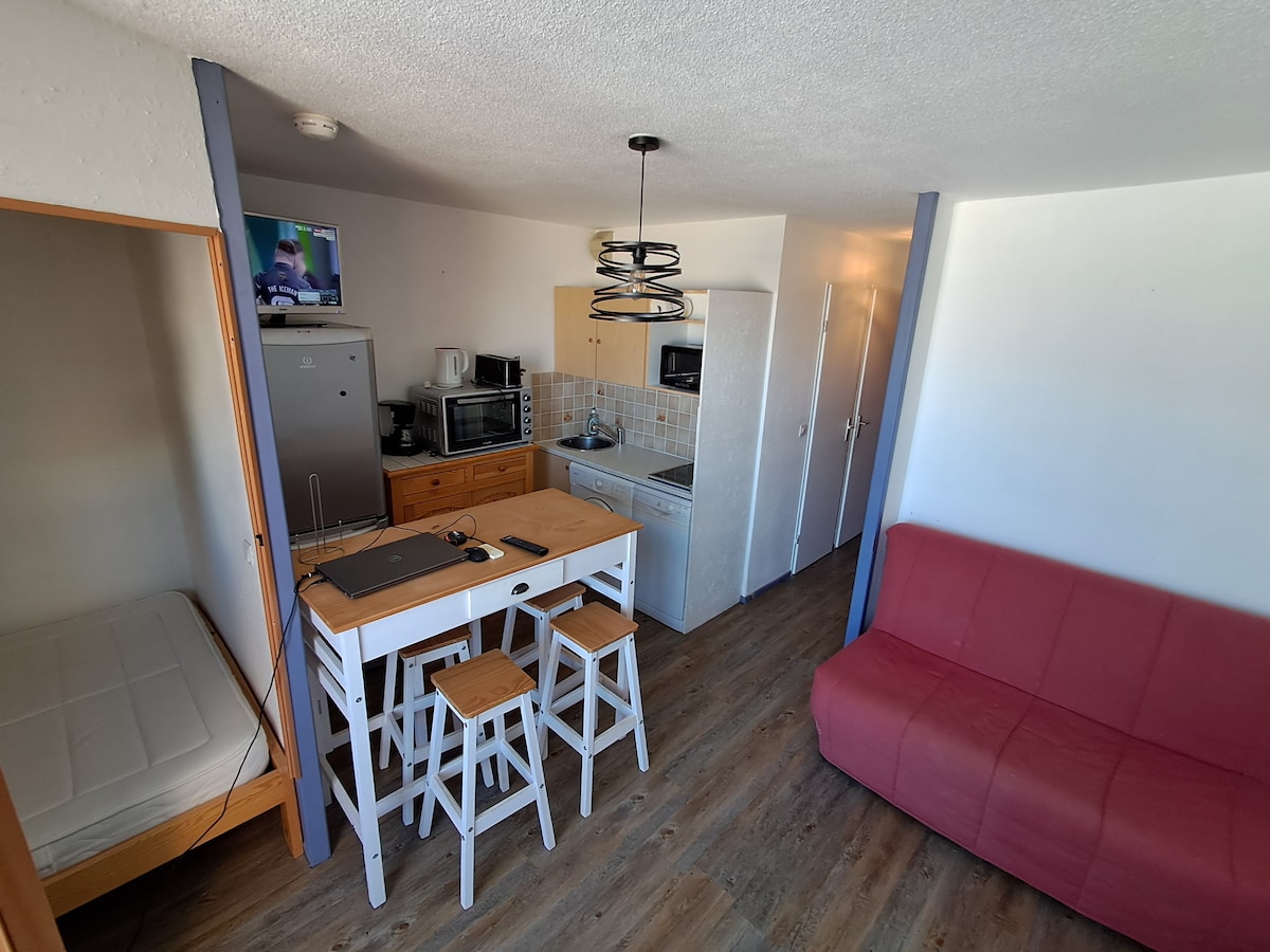 Simplifíquese la vida en este estudio reformado, tranquilo e idealmente ubicado. Venga a disfrutar de su terraza con vistas a la montaña. Situado en la planta baja, muy luminoso, agradable y funcional gracias a sus espacios optimizados, este estudio consta de una hermosa sala de estar con cocina totalmente equipada, una zona de montaña con litera (90×190), un hermoso baño con inodoro. En la sala de estar, el sofá se convierte fácilmente en una cama queen size de 160x200.