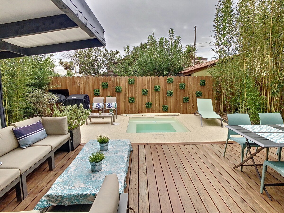 alojamiento tranquilo y elegante. Sus noches serán tranquilas en ropa de cama nueva y de alta calidad. El bosque de pinos está a 100 m para sus paseos románticos. Esta casa está a 400 m a pie desde las primeras tiendas, Se puede acceder rápidamente a los carriles bici, la playa de la hume está a 1,5 km y el centro de Arcachon a 4,5 km. El puerto con degustación de ostras es fabuloso. Prest sup: masaje intuitivo, bienestar profundo garantizado. PISCINA climatizada a partir del 30 de abril si el tiempo lo permite