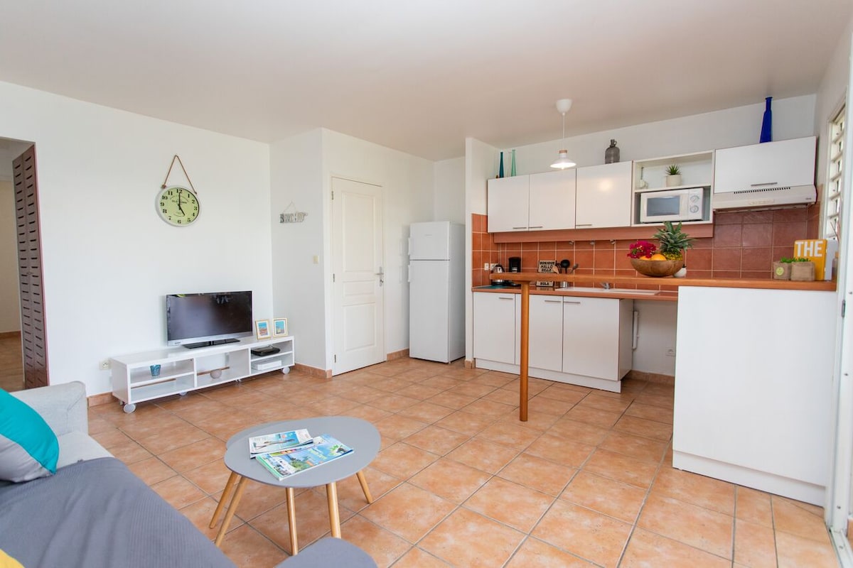 Estudio luminoso y zen en Le Gosier, a menos de1 min a pie de la playa con vistas al mar desde la terraza. Ideal para una pareja o un(a) viajero(a) solo. Totalmente equipado: cama cómoda, cocina, aire acondicionado, wifi, depósito de agua. Residencia segura, cerca de restaurantes y comercios. Perfecto para una semana de relajación o teletrabajo en Guadalupe. ¡Superanfitrión, consejos personalizados incluidos!