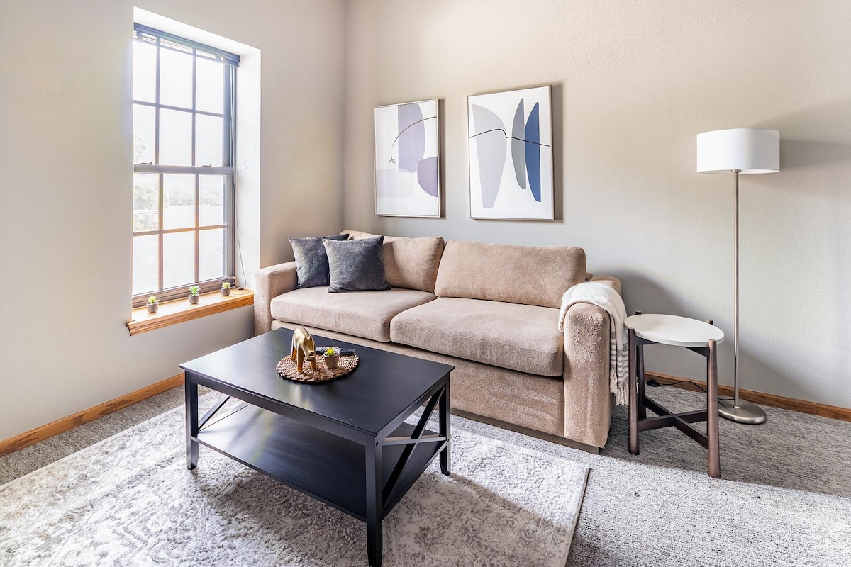 Situado en la calle principal del centro histórico de Leavenworth en Delaware. Excelente zona local, restaurantes y actividades. A solo una manzana de Carousel Museum, un centro comunitario con tarifas muy razonables para la piscina y el gimnasio, y un cine. A dos cuadras se encuentra el río con senderos para caminar. A 2 minutos en coche de Ft. Leavenworth, hay un sofá no plegable para una tercera persona, si es necesario.