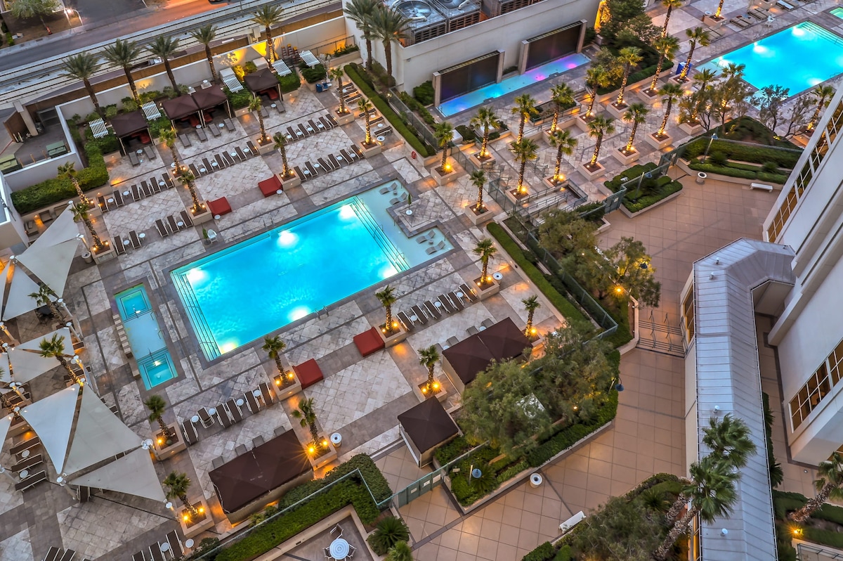 Vacaciones con piscina y jacuzzi con vistas al Strip de Las Vegas