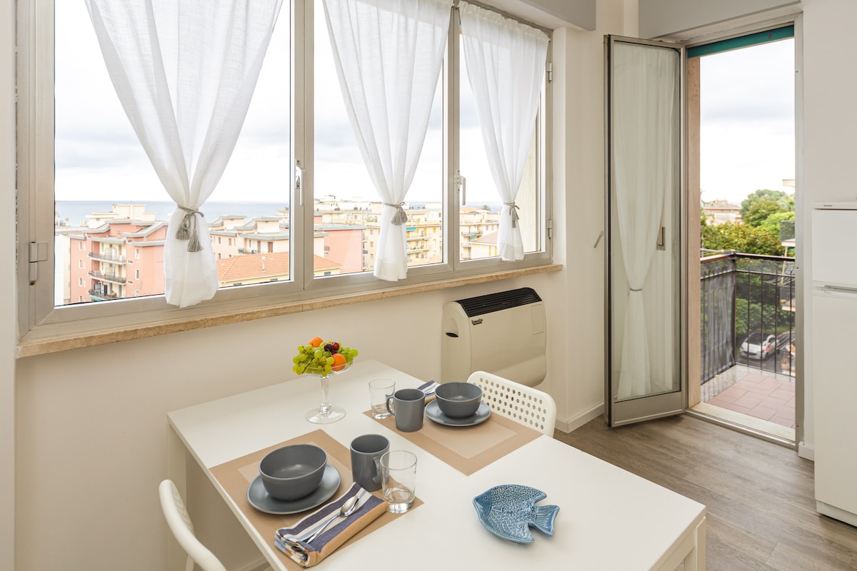 The apartment is 32 m2, located 250 m away. from the sea, and enjoys a splendid view of the Gulf of Cogoleto. It is located in a small building with shared parking in a private area, on the third floor without a lift. The apartment is located near the railway. The neighborhood is quiet and Cogoleto is a typical Ligurian town where you can enjoy the sea but also go on splendid excursions in the Beigua Park or a game at Golf Club in Lerca at 4km from Cogoleto.