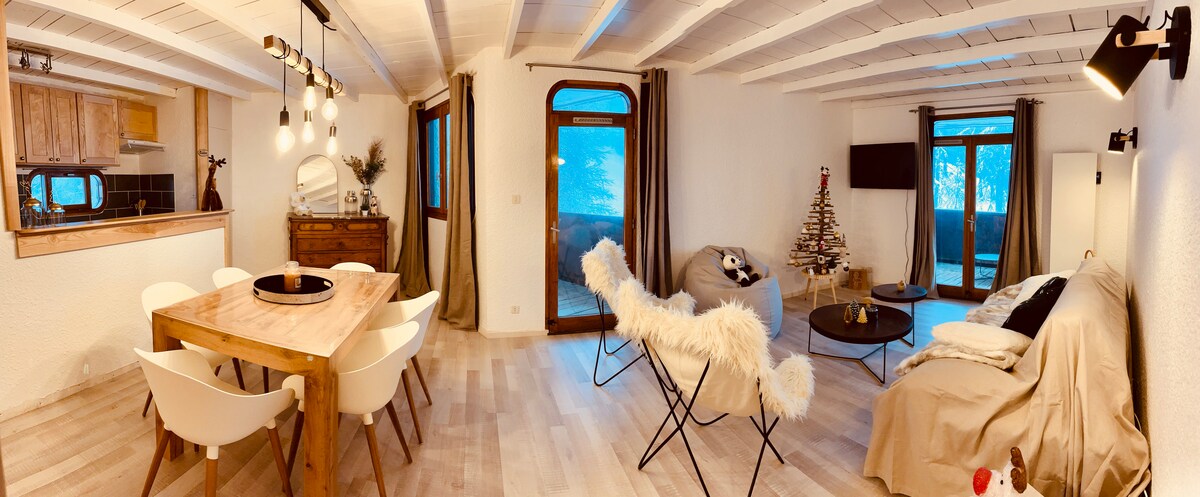 Aproveche al máximo este alojamiento tranquilo y céntrico, situado a 3 minutos a pie del centro de la estación, de los remontes, tiendas, bares y restaurantes, les Orres 1650. Acogedor estudio para 4 personas, ideal para 2 adultos y 2 niños. El balcón da al bosque y al valle del lago de Serre Ponçon, perfecto para momentos de descanso y relajación. Bien equipado (TV, microondas, Nespresso, aparato de raclette), ¡todo para pasar una gran estancia en esta encantadora estación de Orres!