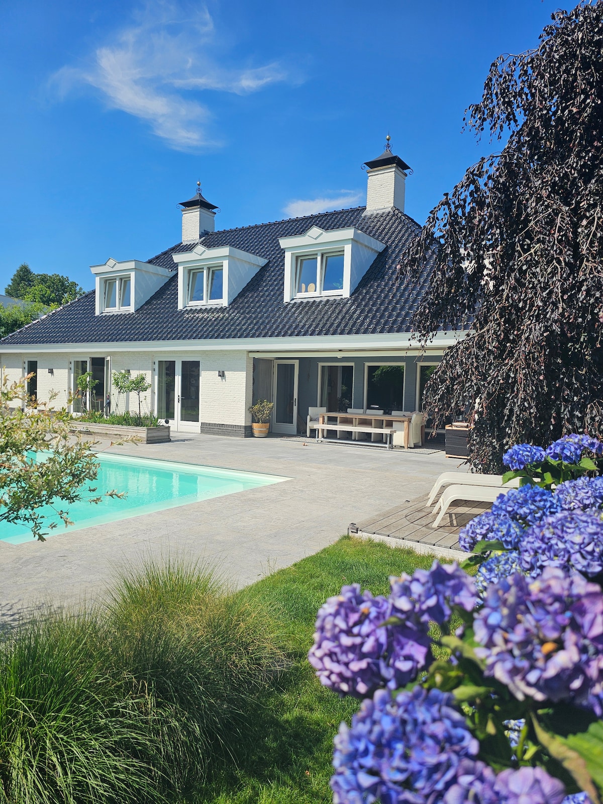 Hermoso y espacioso bungaló independiente con piscina climatizada con plataforma para niños y un gran jardín cerrado con total privacidad. Ubicación tranquila. Outlet de diseño, museos, plaza del mercado, iglesias históricas y Maasplassen. Sala de estar con zona de estar, rincón de televisión y chimenea. Cocina amplia totalmente equipada. Terraza cubierta con zona de estar, mesa de comedor, barbacoa y sistema de TV/audio. Baños completos con bañera, ducha de efecto lluvia, lavabo doble y WC. Cuatro dormitorios, 3 de ellos con TV. Wifi en todas partes.
