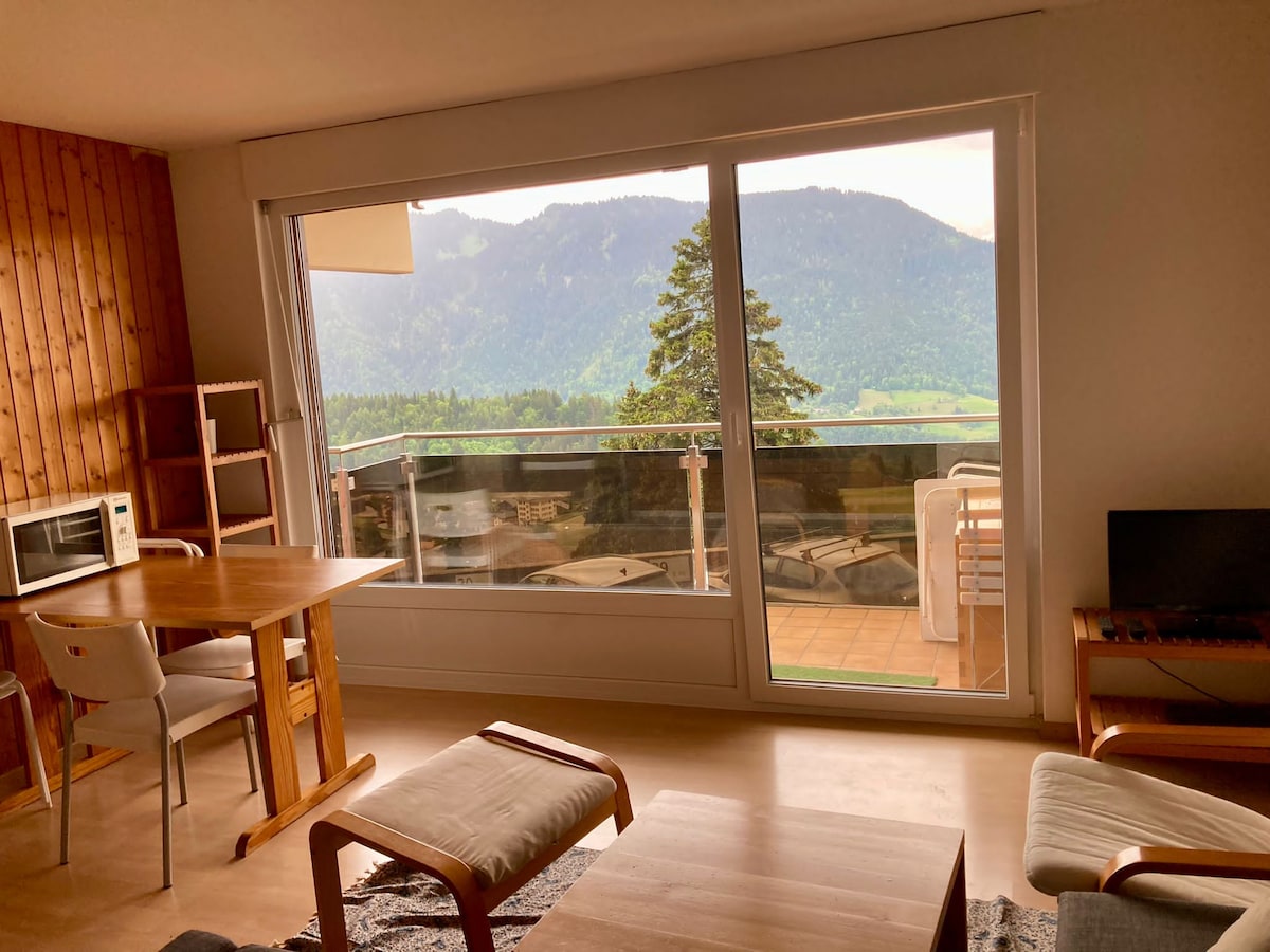 Bienvenue dans notre studio indépendant niché au sein d'un charmant chalet à 5 min en voiture de Leysin. Notre chalet vous accueille avec une vue panoramique sur les alpes vaudoises. C'est dans ce cadre enchanteur que nous avons aménagé un studio indépendant, offrant à nos hôtes une immersion totale dans la beauté naturelle de la région. À l'intérieur du chalet, vous trouverez votre studio privé, équipé d'une kitchenette, d'un coin repas, d'une salle de bain privée et deux lits douillets.