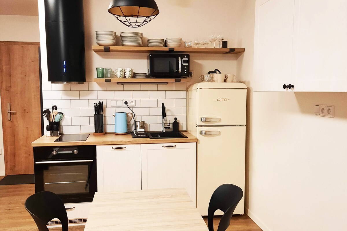 ¡Somos 2 en 1 ... apartamentos con las ventajas de una casa de campo! Te alojarás en un apartamento superiormente equipado, que tienes todo para ti y al mismo tiempo puedes usar las otras áreas de toda la casa: sala de juegos para niños, sauna, terraza, jardín, piscina, pérgola con parrilla, garaje. ¡Y un bar compartido! También hay una máquina de café de calidad y cerveza de barril de la microcervecería ;) El espacio entero es juguetón, pensado en detalle, es inteligente y autoservicio. ¡Mimamos a nuestros huéspedes!