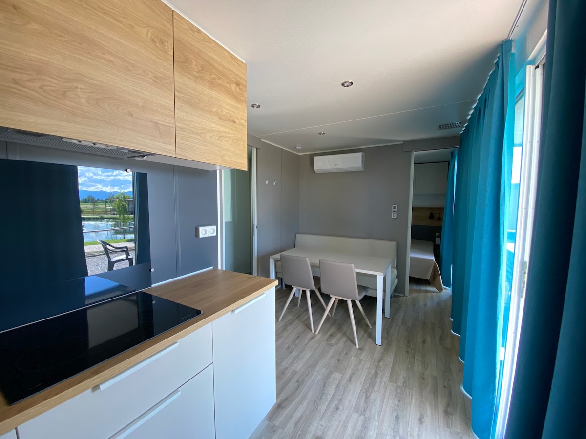 Casa móvil con aire acondicionado en muy buen estado de 35 m² ,sdb con cabina de ducha,inodoro, 1 hp con cama de 140, 1 hp con 2 camas de 80,zona de cocina con microondas, nespresso, hervidor,tostadora, estufa de gas (sin horno),nevera,congelador detector de humo,detector de CO2,extintor de incendios,aspiradora . terreno privado de 1600 m² Columpio terraza muebles de jardín,sombrilla,barbacoa Playa a 150 m ,restaurante,actividades náuticas ,cerca de todos los comercios accesibles a pie ,ruta de senderismo. No se admiten mascotas no fumar