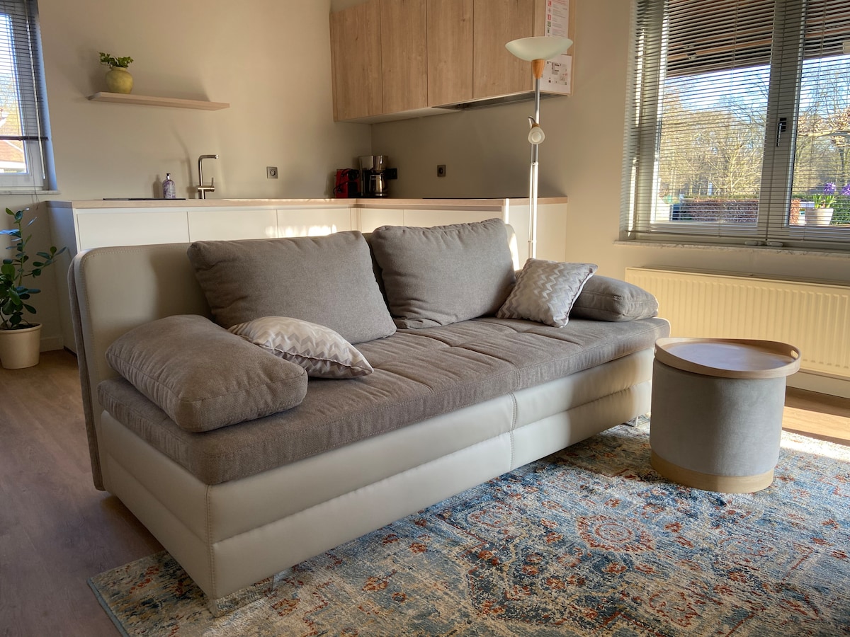Bienvenido a nuestra suite de huéspedes, ubicada en la tranquila Membruggen (Riemst). El espacio es adecuado para 2 personas e incluye una cocina y un baño privados. Las posibilidades de la zona son infinitas. Muy cerca se encuentran el Castillo del Vino de Genoelselderen y Alden Biesen. En esta zona rural hay numerosas rutas de senderismo y ciclismo, pero al mismo tiempo está cerca de la histórica Tongeren, el acogedor Maastricht y las ciudades de Lieja, Hasselt y Genk.