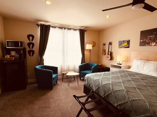 Designed and built in 2025 specifically for Airbnb. Beautiful Hotel style room. All private. King-size memory foam mattress, highest speed internet, stocked mini fridge, microwave, coffee maker, smart TV, custom tiled shower, all the amenities of an upscale hotel, Free dedicated EV charging per room (Tesla). All new, safe,comfortable, clean. Music themed artwork. We are affiliated with the bowling alley in town (PinBowl Alley)Best food, drinks and fun in Limon . Mention for possible discounts.