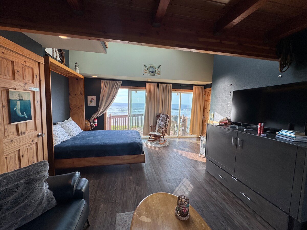 Stunningly Beautiful Ocean View, No Cleaning Fee, Cozy Oceanfront Cottage Apt, overlooking the Pacific Ocean. Private Balcony, chairs and (Electric BBQ summer only). Main room has a King Bed with Kitchenette ,Electric Fireplace, Sofa , Peacock TV and dining table. There is a Bathroom with Shower, Bedroom has a Queen Bed and minifridge/freezer. Kitchenette has salt,pepper,oil, utensils,dishes,cookware,mini oven,Instapot,toaster microwave, Minifridge, two burner stove, drip coffee maker.