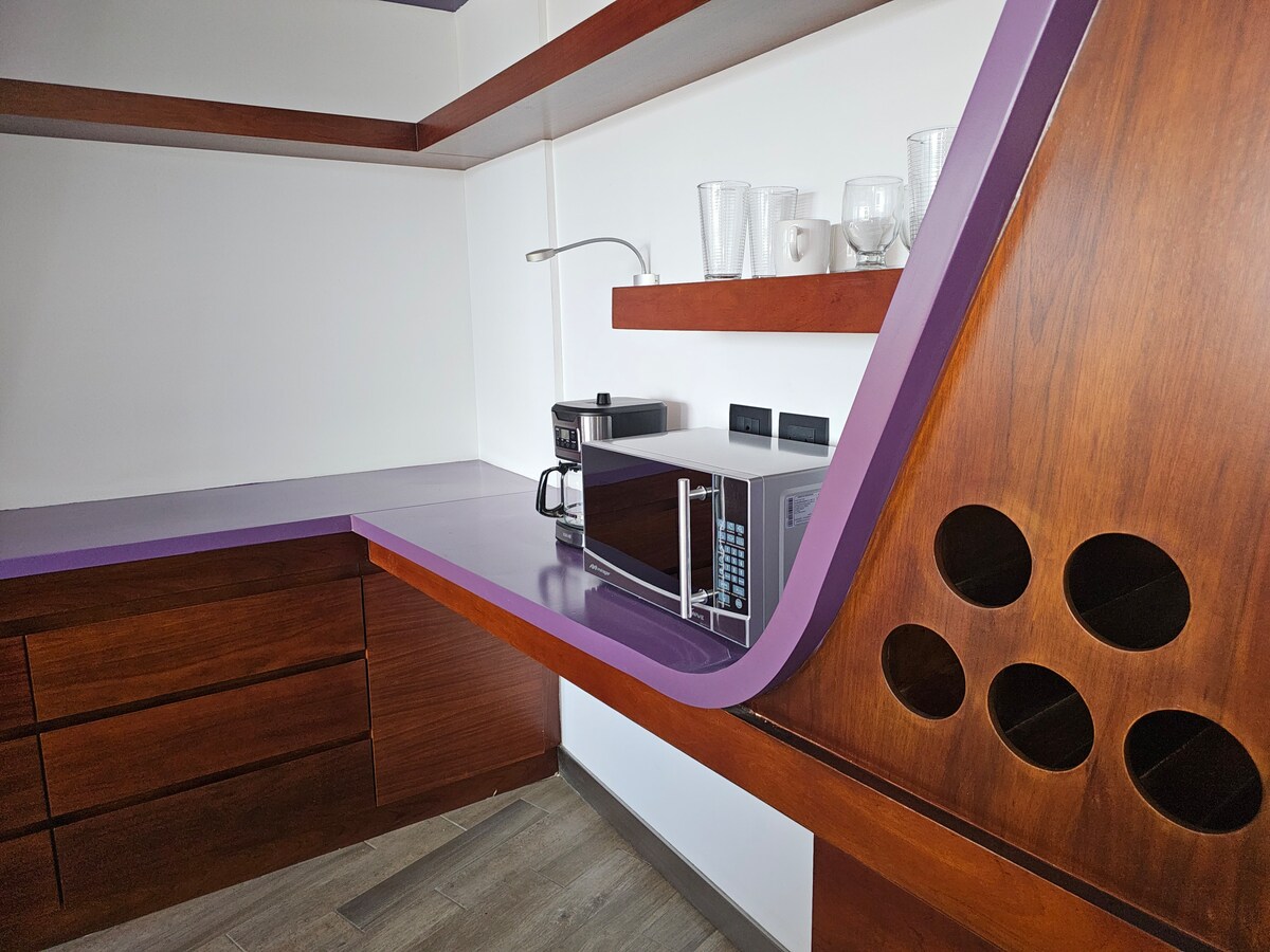 Luxury loft with terrace in Sonata Towers, Lomas de Angelópolis. Features a bedroom with a double bed, plush closet, TV, and a full bathroom with premium fixtures. The living area includes a sofa, dining area with microwave, frigobar, coffee station, and desk. Enjoy covered parking, valet service, and room service from the in-building restaurant. Steps from the vibrant Sonata District—shops, dining, and cultural activities. Ideal for business or leisure, with 24-hour security for a safe stay.