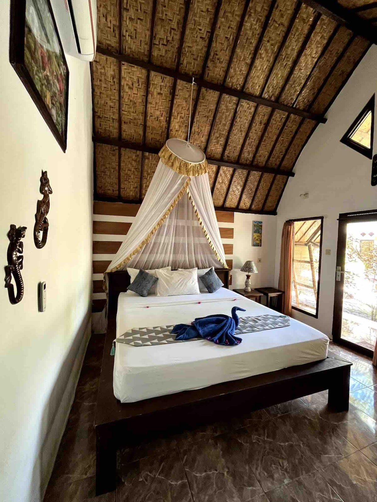 Escápate a nuestro bungalow frente a la playa en el norte de Lombok, un verdadero paraíso para aquellos que buscan una escapada tranquila. Este espacioso refugio está ubicado justo en la playa y ofrece hermosas vistas al mar cristalino. Acomódate en una hamaca con un buen libro mientras disfrutas del arte de la relajación o pasea por la arena volcánica oscura de esta playa única. Sumérgete en las aguas cristalinas para darte un refrescante baño, coge tu equipo de esnórquel para explorar un mundo submarino o visita las cascadas cercanas.