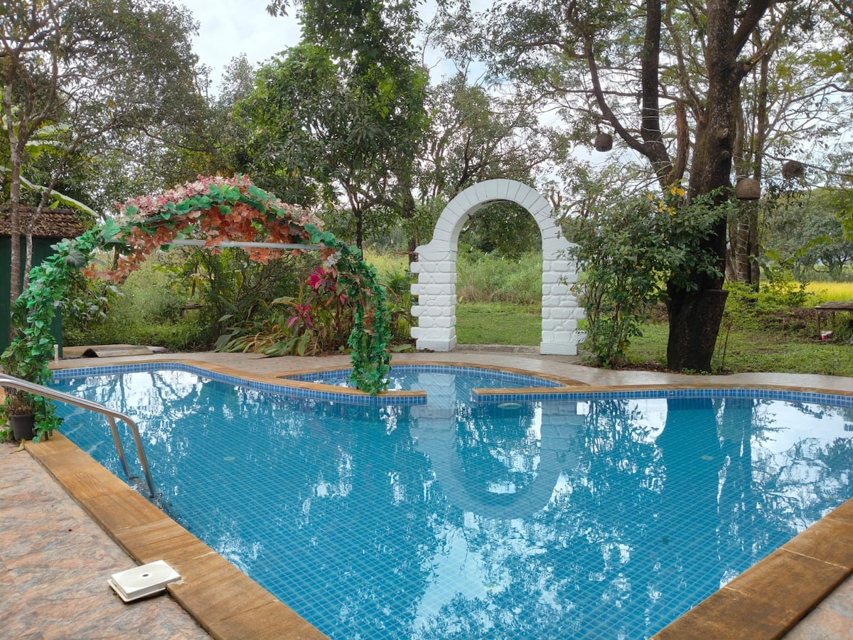 Una pequeña casa de campo buena para una pareja o un grupo pequeño (máximo 6). Es una habitación grande que tiene 2 camas dobles y 2 camas individuales para grupos y una cama doble individual y 2 camas individuales para descansar. Además, tiene un baño adjunto y un comedor dentro de la casa. Una piscina a una distancia de 100 metros, mucha flora y fauna para descubrir. Se admiten mascotas. Comida que te recuerda el placer de comer. Esta casa de campo se encuentra dentro de los 2 acres con otras 2 casas de campo de varios tamaños y un bungalow con 3 habitaciones.