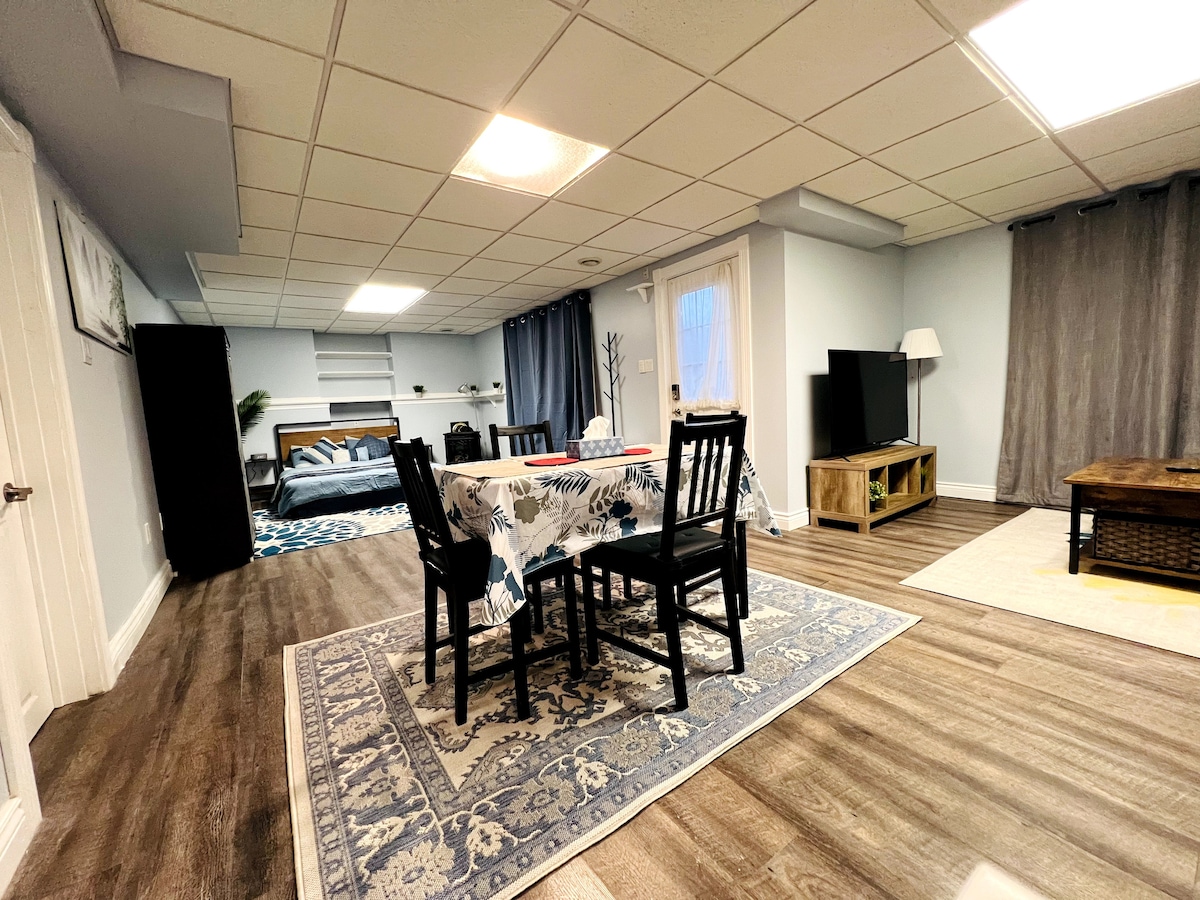 Bienvenido a nuestro apartamento estudio de concepto abierto de 1 dormitorio. Es una unidad de nivel inferior con ventanas completas y una entrada privada a pie. Situado en el noreste de Londres, ofrece fácil acceso a tiendas de comestibles, menos tráfico y cercanía al aeropuerto de Londres. Los huéspedes también tendrán acceso a 1 plaza de aparcamiento en la entrada, patio compartido, patio trasero y chimenea en el patio. Ideal para profesionales, parejas jóvenes o familias pequeñas. :)