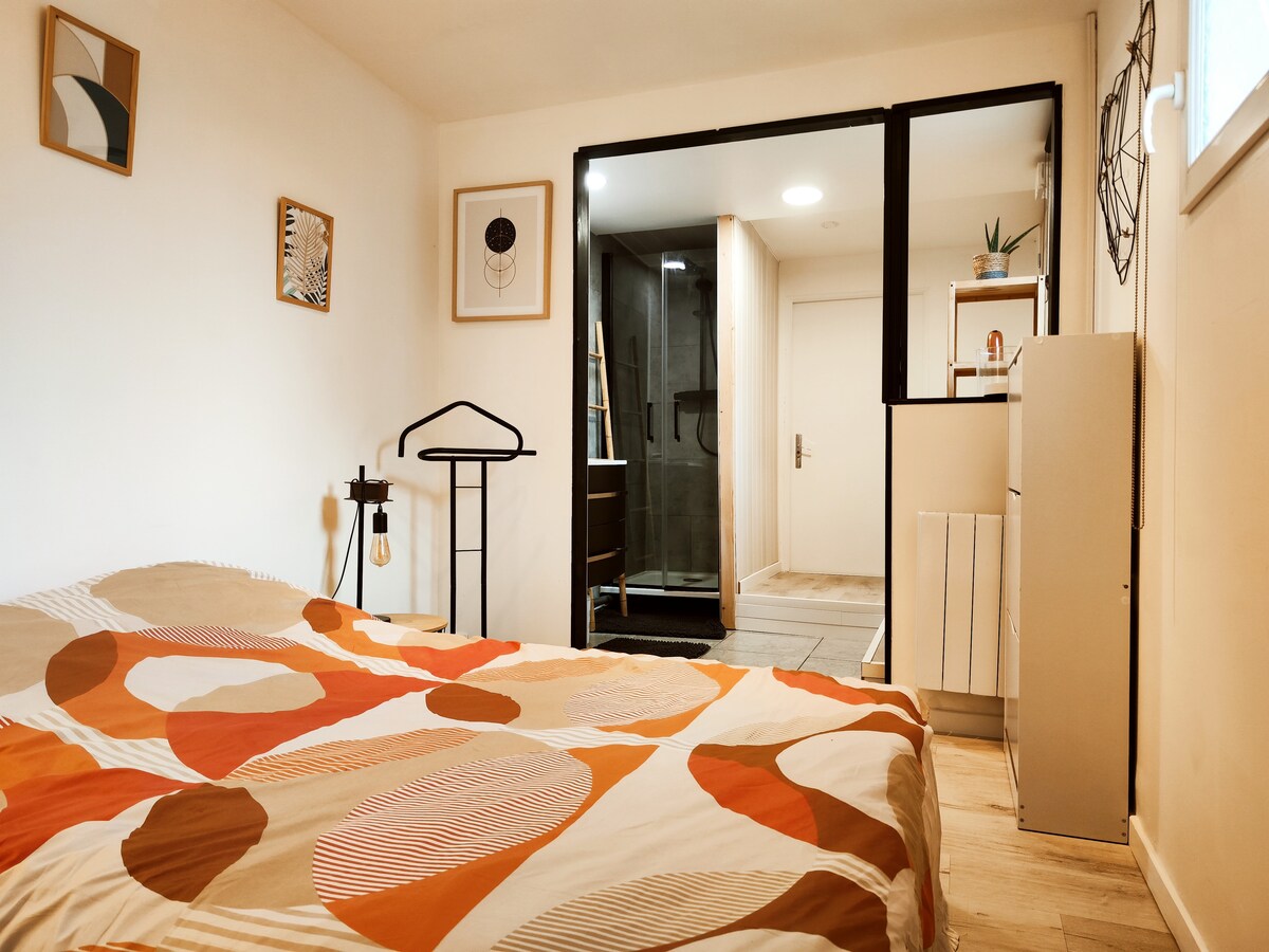 Estudio de 14 m2 totalmente equipado y completamente independiente en el jardín de la residencia privada que incluye: una cocina equipada con zona de comedor (placa eléctrica, nevera/congelador, hervidor de agua, cafetera con cápsulas, microondas y utensilios de cocina), una cama para dos personas, una ducha, un inodoro, un lavabo, una televisión y wifi de buena velocidad gracias a un adaptador. El estudio tiene calefacción, y las sábanas y toallas están incluidas. El aparcamiento es gratuito en la calle tranquila e iluminada.