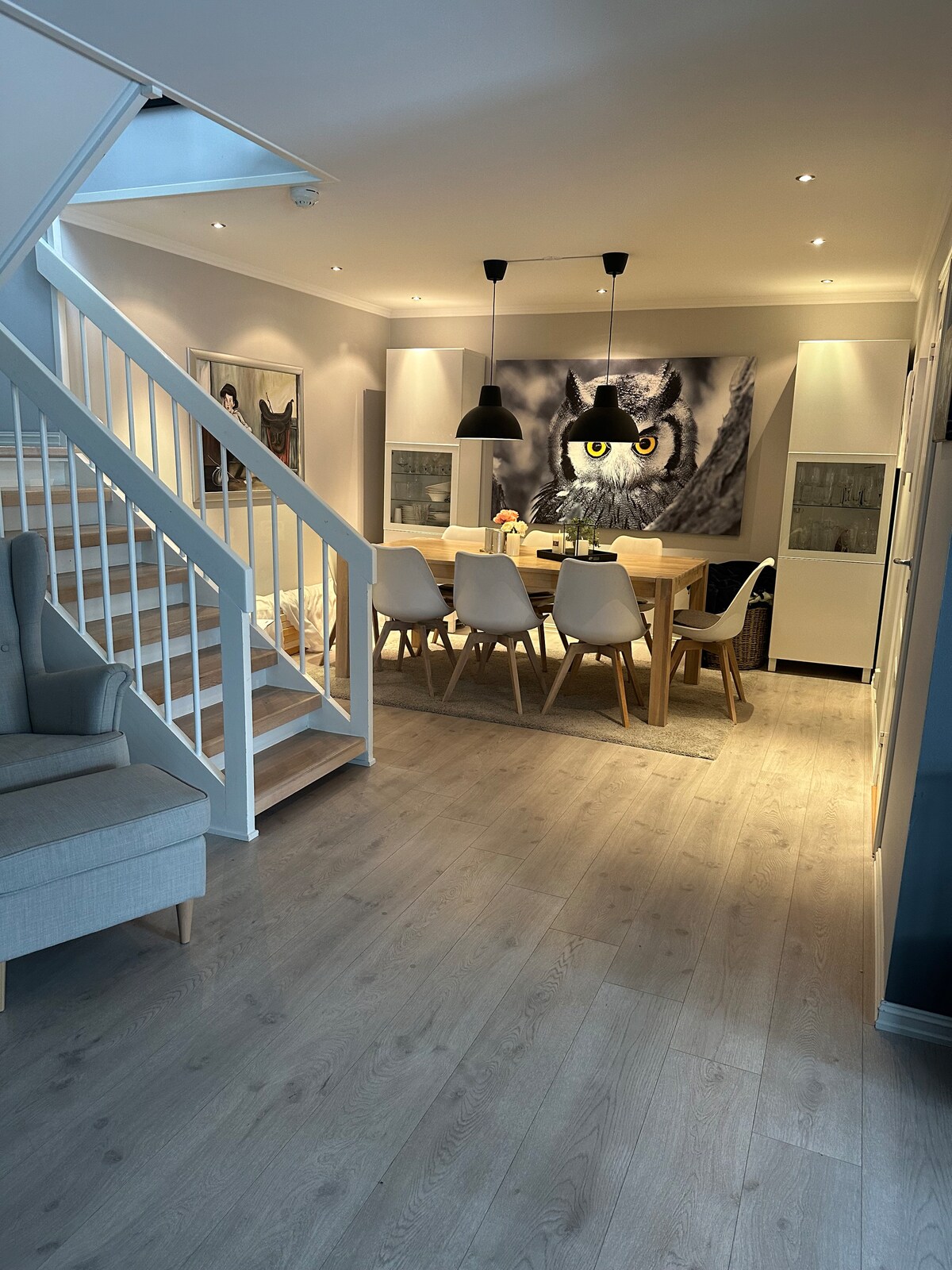 Relájate con toda la familia en este lugar tranquilo para hospedarte. Acogedora casa adosada que consta de 3 medios pisos. La zona de entrada consta de un pequeño pasillo con armario con puerta corredera, lavandería/inodoro y baño y cocina. Subiendo un tramo de escaleras llegarás a 2 dormitorios. Ambas tienen 1,50 camas y TV. Un dormitorio también tiene un sofá que se puede colocar como una cama individual. Abajo hay un gran salón con mesa de comedor y espacio para 8 personas y un sofá esquinero con TV. Un dormitorio con cama de 180 Queremos gente tranquila. Nada de fiestas.