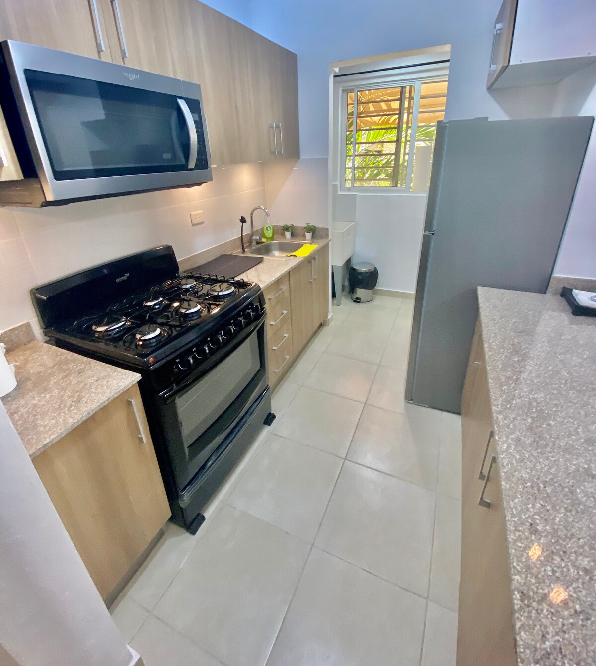 Acogedor apto. con parqueo gratis, cocina equipada, 2 baños con agua caliente en las duchas, sala, comedor, balcón, 2 habitaciones, en área segura y tranquila. Dentro del condominio está una iglesia Católica, parques para niños, cancha, plaza comercial con: bancos, farmacia, supermercado, restaurantes, heladería, salones de belleza, entre otros.
