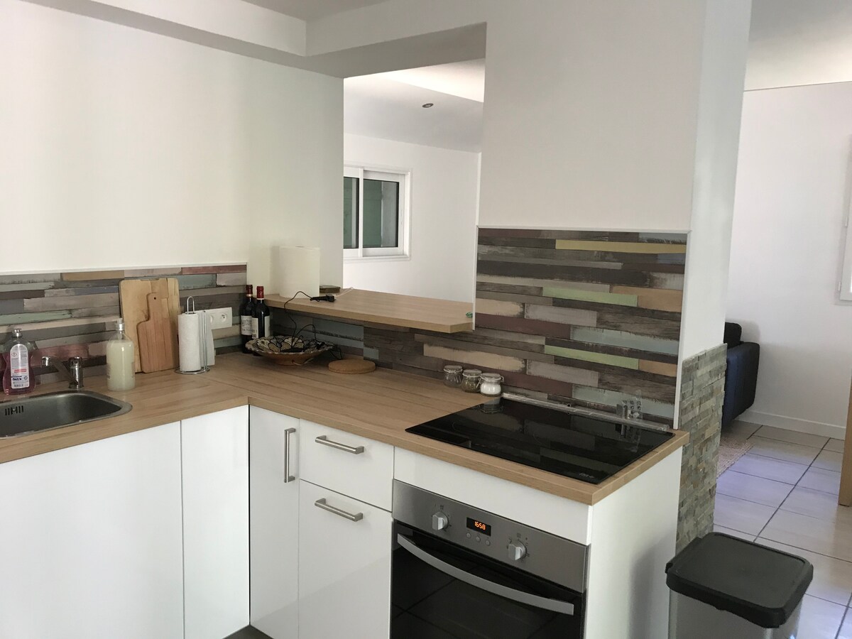 Casa nueva rodeada de bosque al lado del carril bici y las playas de la costa de las Landas Consta de una sala de estar con cocina americana, 3 dormitorios, incluyendo 1 suite principal con baño y aseo, y otro baño y aseo independiente. Fibra óptica 🛜 En el exterior, una piscina orientada al sur de 4 x 8,5 m climatizada de abril a 11 de noviembre con jardín paisajístico y 110 m2 de terraza de madera. Playa y golf de Moliets y Maa a 10 minutos Vieux Boucau a 15 minutos Hossegor a 28 minutos. Biarritz 50 min