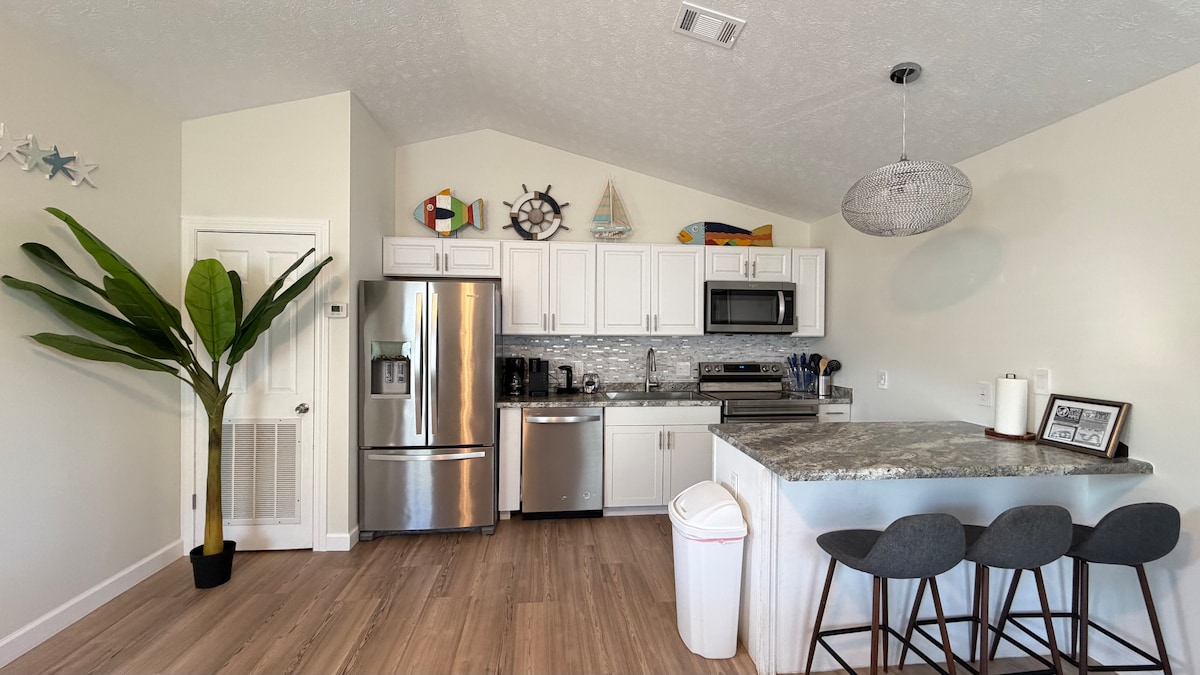 2 bed/2 bath home, with spacious private backyard, few blocks from the beach is welcoming up to 6 guests PETS STAY FREE :) Living room has a flat screen Roku TV, back door leads to the patio with a grill Master bedroom has a queen size bed, a full bathroom with a shower/tub combo. Guest bedroom has two twin size beds and a bunk bed. Guest bathroom has a walk in shower Kitchen area is fully equipped with everything you need to cook your favorite meal