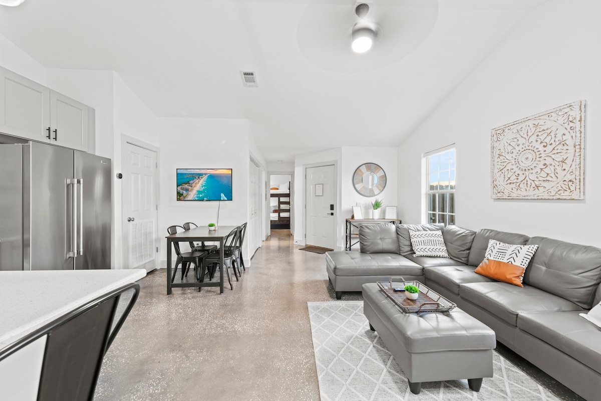Message us for special winter discount! Enjoy a relaxing experience at our charming, perfectly located 2 bed, 2 bath, beach bungalow steps away from the most beautiful beaches in Florida Located only 1 block from the white sandy beaches of PCB. If you get sick of the beach, you are a short distance from great bars, restaurants, and the beautiful St. Andrews State Park Schooners, Patches, Newby's & TOOTSIES are just around the corner making for a great walk home after dinner and drinks.