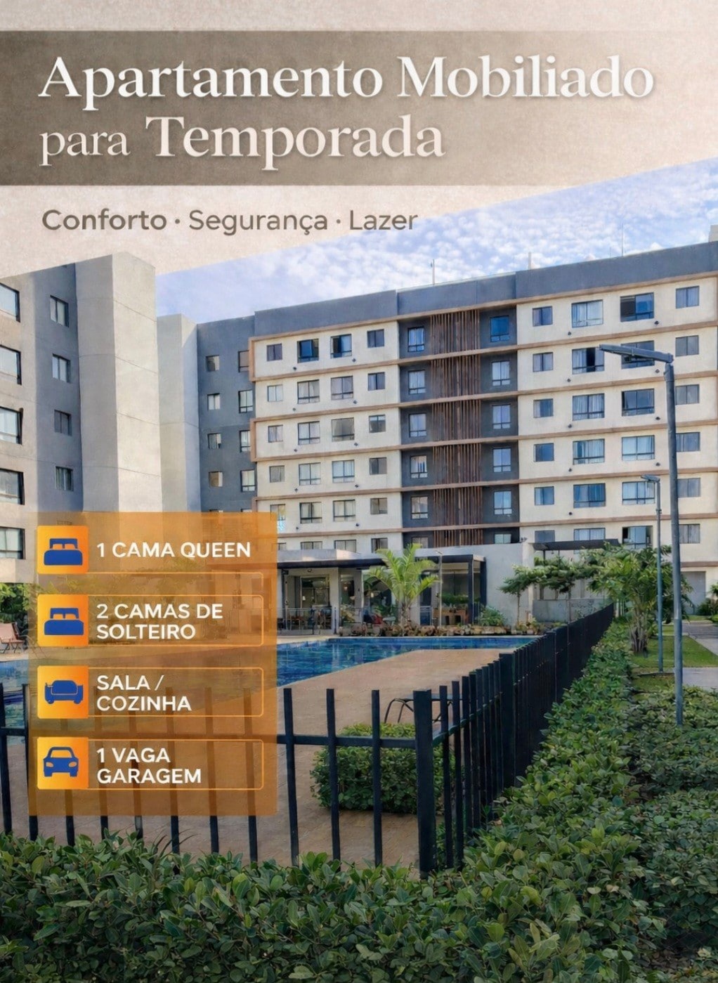 Apartamento nuevo y acogedor 02 habitaciones Cama doble Colchón individual/para niños adicional Ropa de cama Aire acondicionado Habitación Sofá cama Aire acondicionado Tv 50p Toshiba 4K LED Smart Wi-Fi Canales de televisión Cocina. Refrigerador ° Microondas; Licuadora Cocina Sanduicheira • Cafetera Utensilios de cocina completos Exfoliante de aire Café/azúcar/sal/vinagre/aceite de oliva Mesa / Sillas Baño Secadora de pelo. Toallas faciales y de baño Champú /acondicionador / jabón Tabla y plancha