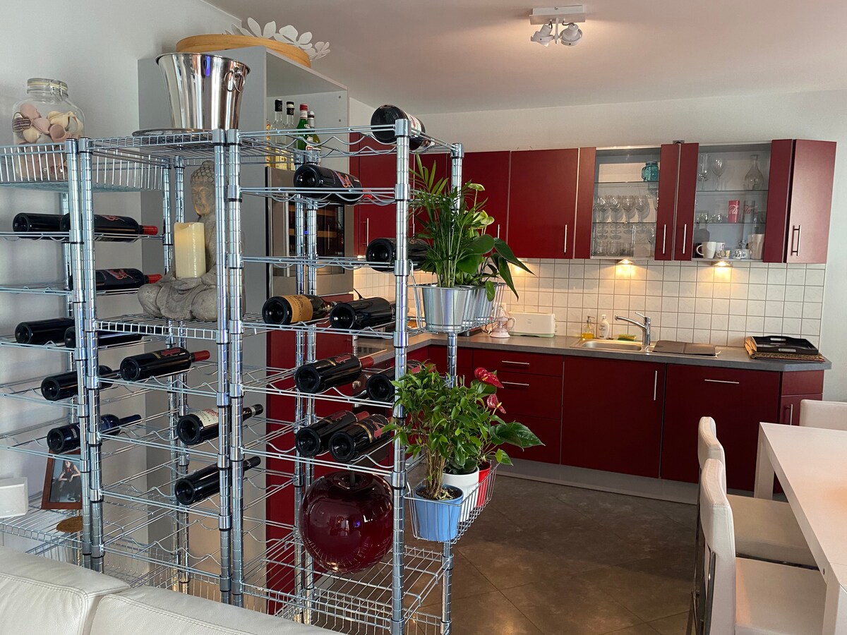 Un apartamento elegantemente amueblado en el segundo piso de nuestro edificio de apartamentos: 2 dormitorios cada uno con una cama doble, baño con ducha, sala de estar grande con sofá cama. Un comedor para 6 personas y una cocina totalmente equipada. Incluye wifi y SmartTV. Un estacionamiento público gratuito junto a la casa. A 15 minutos en auto de la capital. Hay una parada de autobús justo enfrente de la casa. Soy muy accesible como anfitrión porque vivo en el mismo edificio.