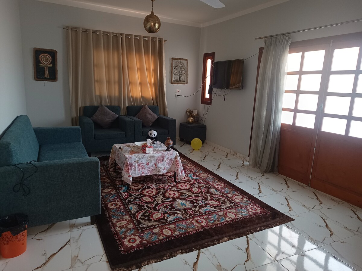 Este apartamento se encuentra cerca del templo Medinet Habu, así como de varios otros lugares históricos. Es un apartamento amueblado de tres dormitorios (sólo dos dormitorios están amueblados) completo con utensilios de cocina, estufa, horno, nevera. Cuando salgas a tu balcón, verás plantaciones verdes y palmeras con impresionantes montañas desérticas como telón de fondo. Debido a la baja población de la zona y a la distancia de las principales carreteras, las noches son muy tranquilas y silenciosas.