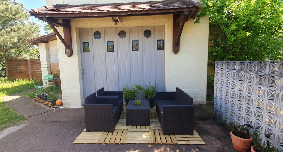 Belle chambre indépendante 15m2, sdb privée avec douche hydromassante, parking privatif, entrée privée (baie vitrée), volets, rideaux occultants, lit 160x200. Minibar, eau, cafetière Nespresso, capsules de café , bouilloire, thé, tisane, biscuits, micro-onde, couverts. Option P’tit Déj 9€ (Pain, Viennoiserie, beurre, confiture, yaourt, fruit, jus de fruit, chocolat en poudre, lait). Fauteuil, TV, rangement. Table/fer à repasser. Jardinet privé avec table et chaises. Canapé extérieur.