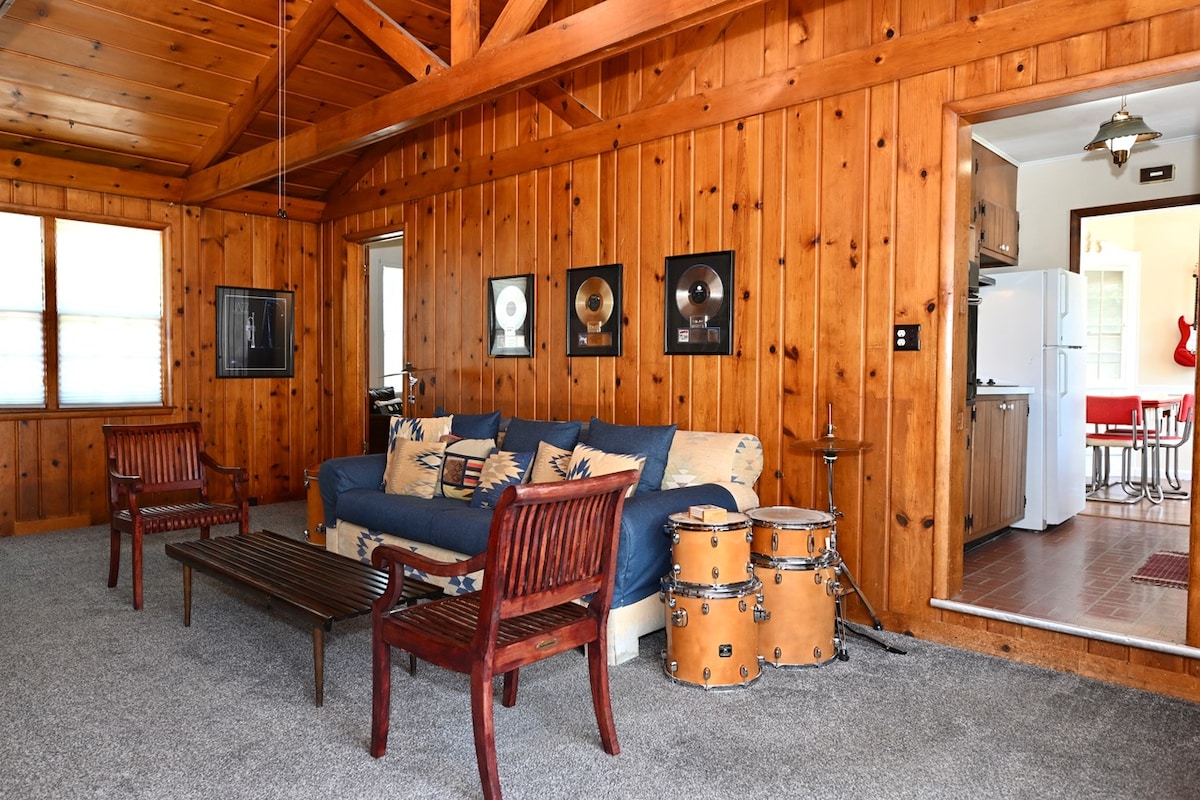 Esta cabaña estudio es ideal para 2. La cama tamaño queen de troncos es el foco principal, pero la pared de la chimenea y la TV de palés de madera también añaden un diseño divertido. El fregadero y la isla de bloque de carnicero funcionan como tu espacio para comer con 2 taburetes junto a la cocina americana que incluye microondas, mininevera y cafetera. La vajilla es apta para microondas y está lista para su uso. El baño cuenta con una ducha a ras de suelo. Te encantará el patio privado con mesa pequeña y sillas y tu propia parrilla. ¡Puestas de sol incluidas!