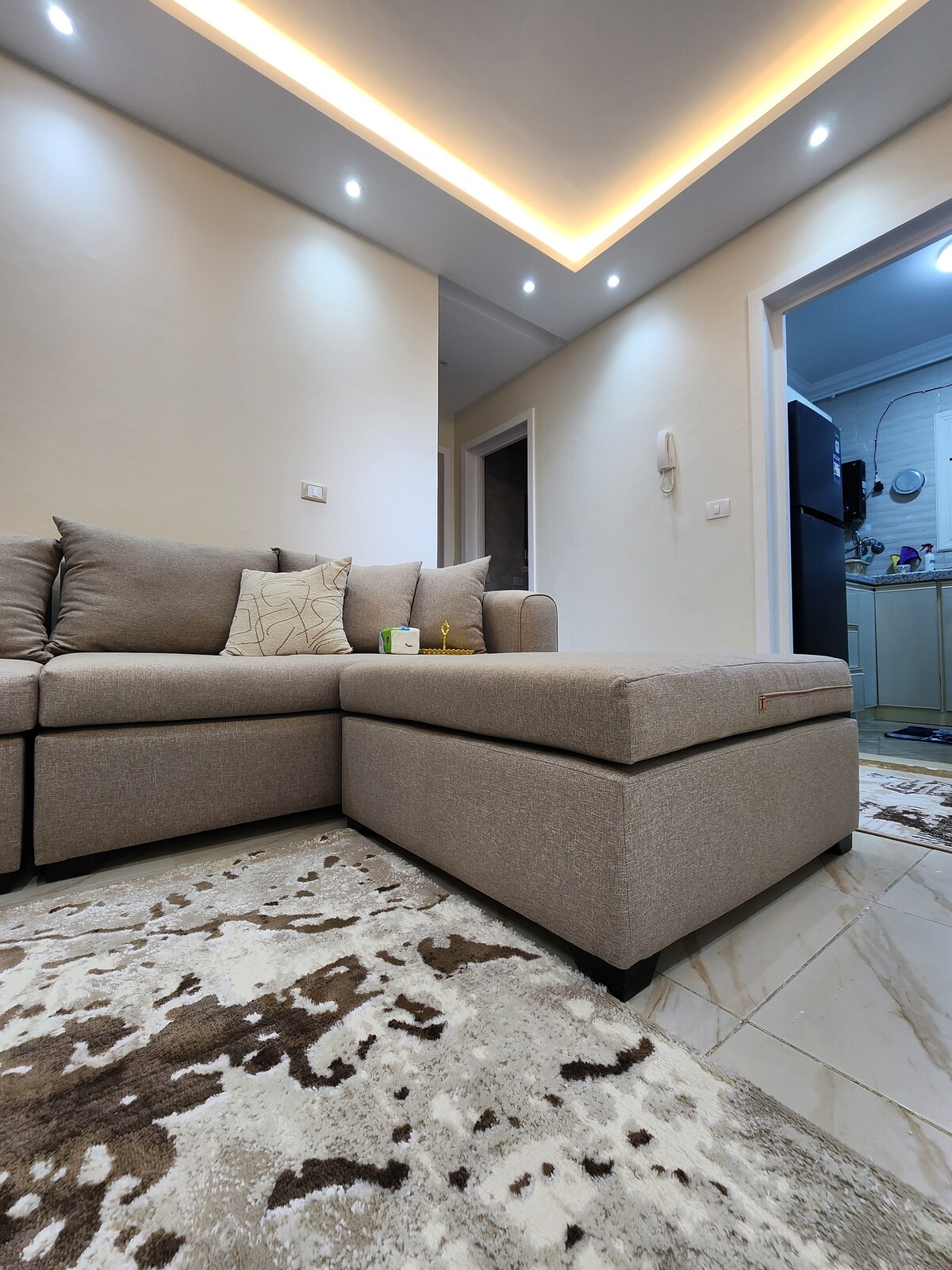 Qué ofrece este lugar • 🛏️ 2 dormitorios (1 principal con baño) + sofá cama • Capacidad para 6 huéspedes • ✨ Cómodo y con acabados modernos • ❄️ 3 aires acondicionados fríos y calientes + electrodomésticos nuevos • 📺 Smart Google TV de 65 pulgadas • 🌐 Internet de alta velocidad de fibra óptica • 🍽️ Cocina pequeña totalmente equipada • 🛋️ Gran sala de estar y comedor • 📍 A 3 minutos de Suez Road • A 8 minutos de Madinaty y Open Air Mall