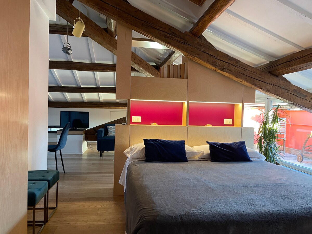 Apartamento de diseño situado en la 3.ª planta de un edificio histórico en el Trastévere. El apartamento cuenta con 1 dormitorio, 1 baño con ducha a ras de suelo, un gran salón y una cocina americana equipada con horno y lavavajillas. Tiene vistas al Tíber y al Vittoriano. Muy bien comunicado con toda la ciudad, es ideal para visitar los alrededores de Piazza Venezia, el Coliseo, los Foros Romanos, la isla Tiberina, la Bocca della Verità, el Capitolio y el Gueto Judío, y para disfrutar del característico barrio romano.